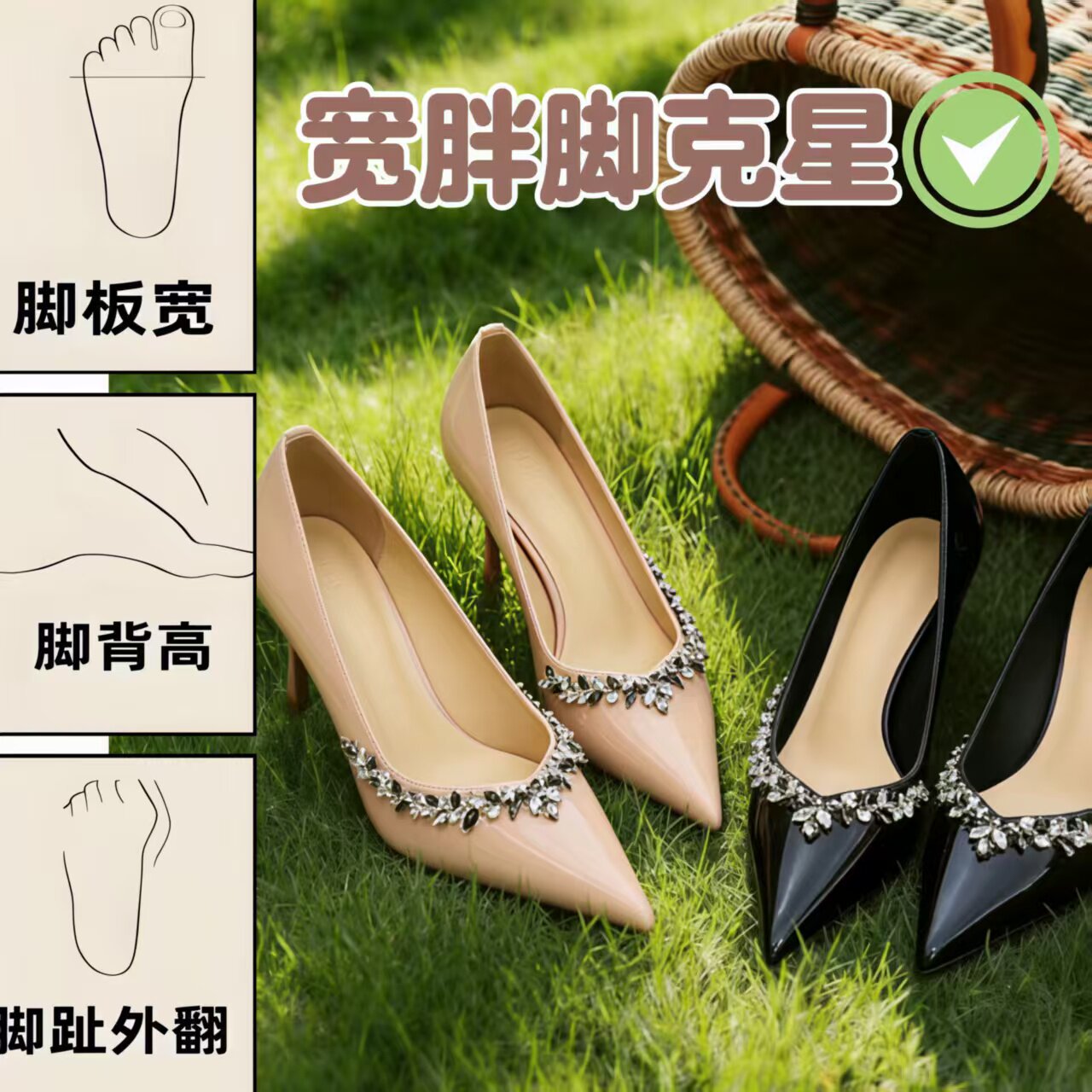 📚 水钻裸色高跟鞋漆皮前掌加宽大码女鞋宽胖脚气质高级不累脚细跟夏