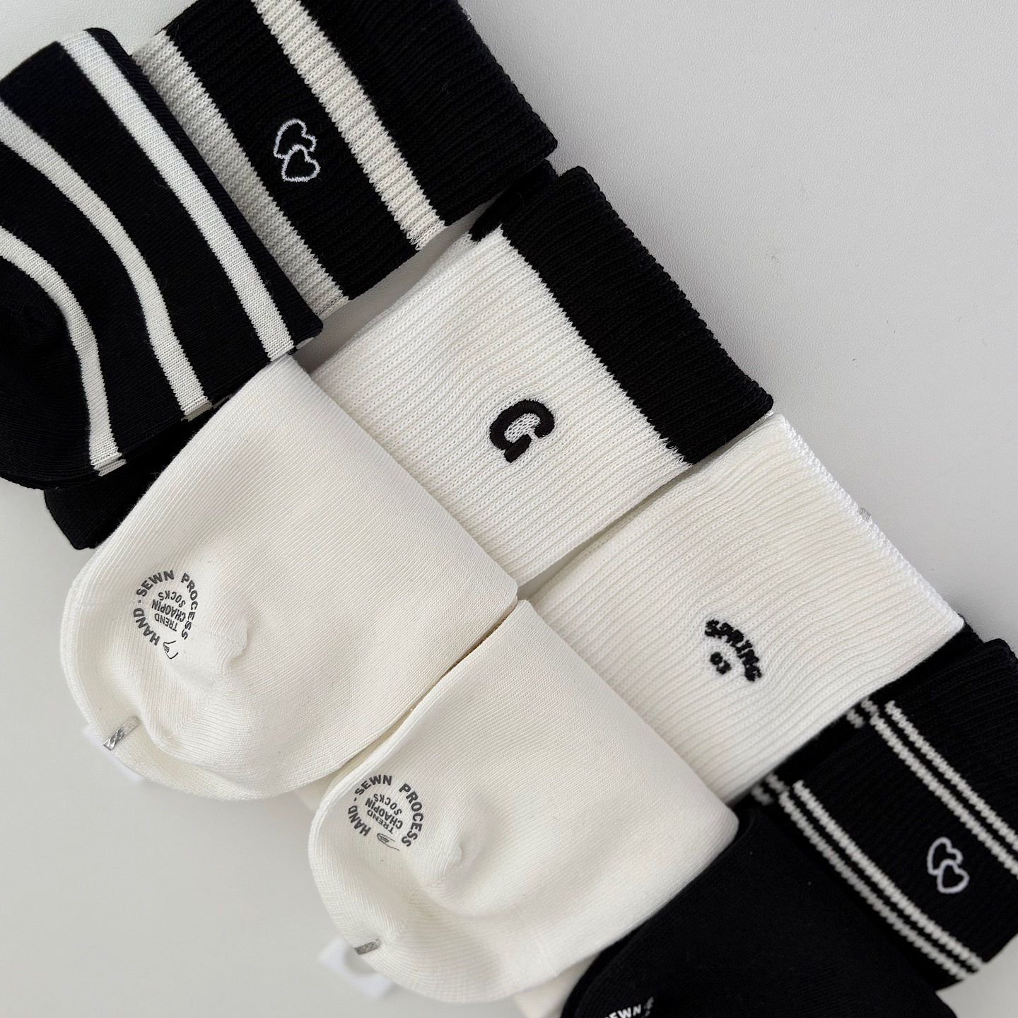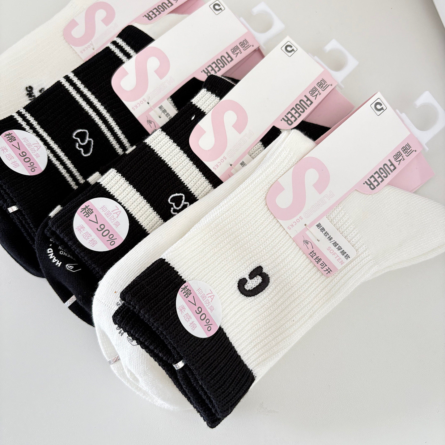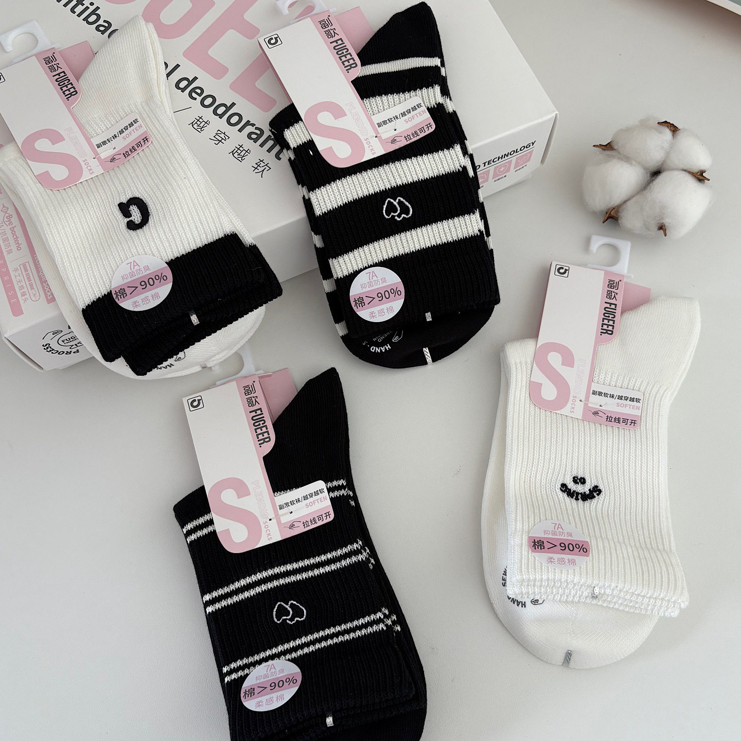 📚 副歌秋冬高棉透气女士中筒袜黑白抑菌防臭抗起球女袜条纹女生潮袜