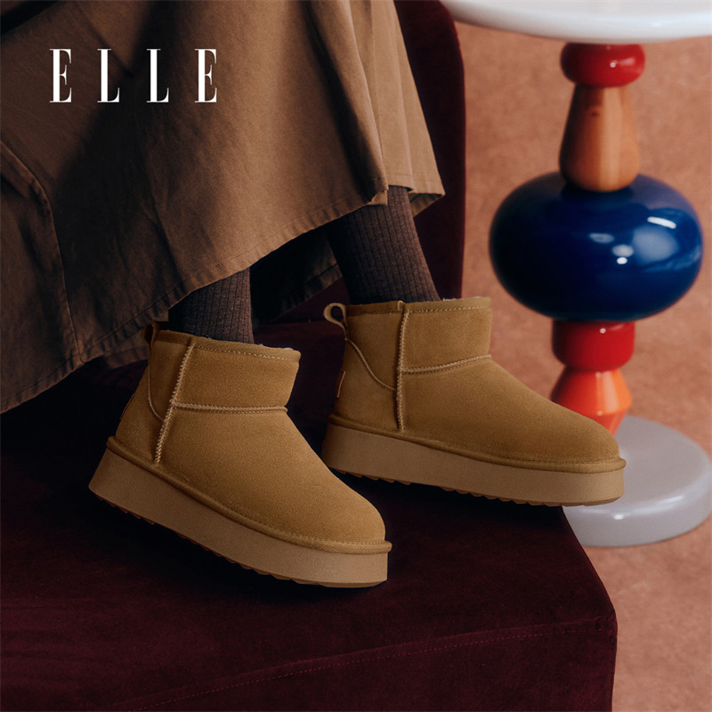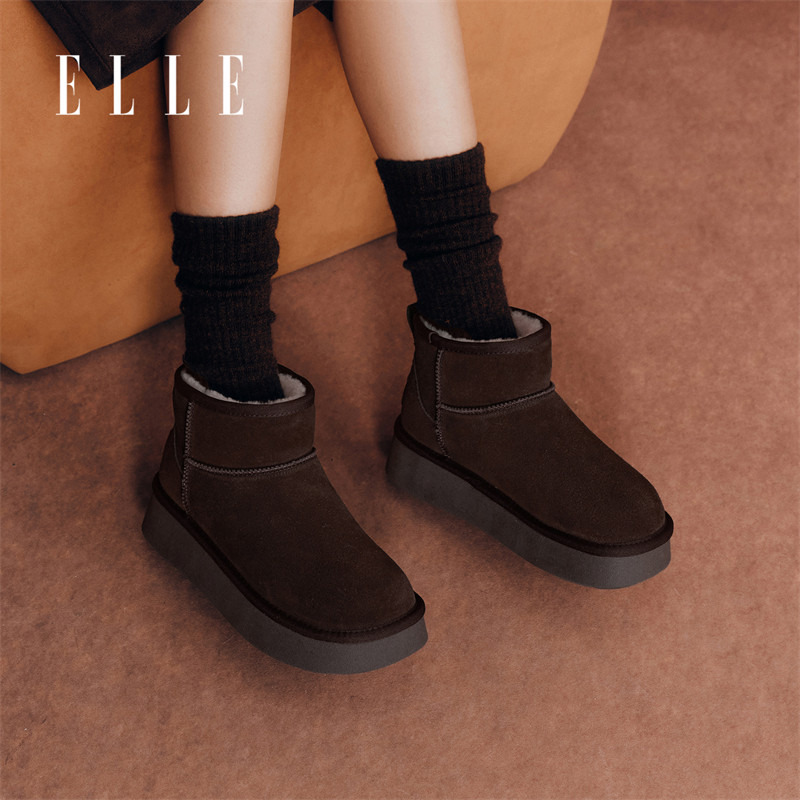 📚 ELLE女鞋2025冬季新款皮毛一体雪地靴女厚底保暖短筒加绒棉鞋短靴