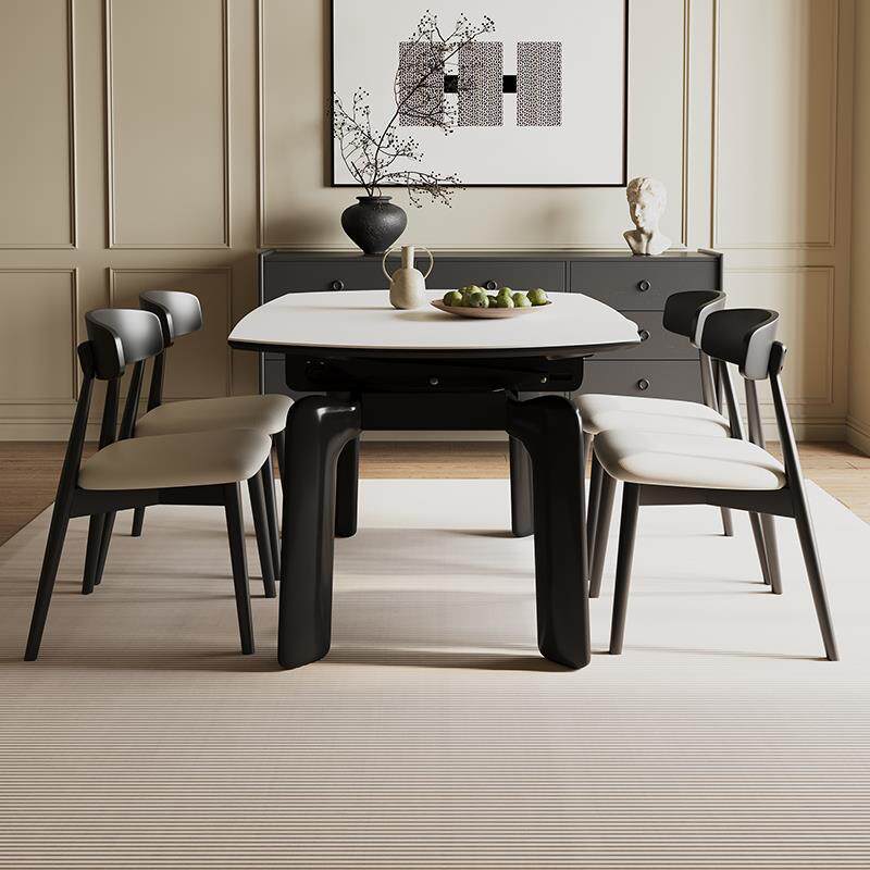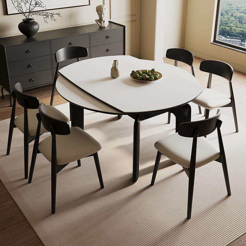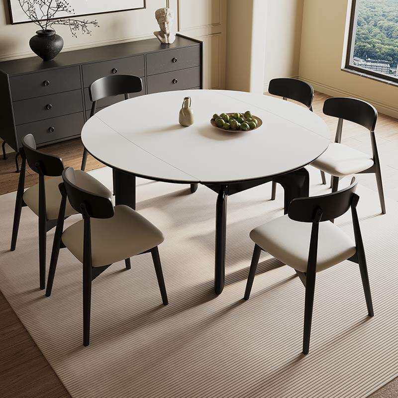 📚 奶油风德利丰纯白实木岩板可伸缩折叠餐桌家用方圆两用可变圆桌