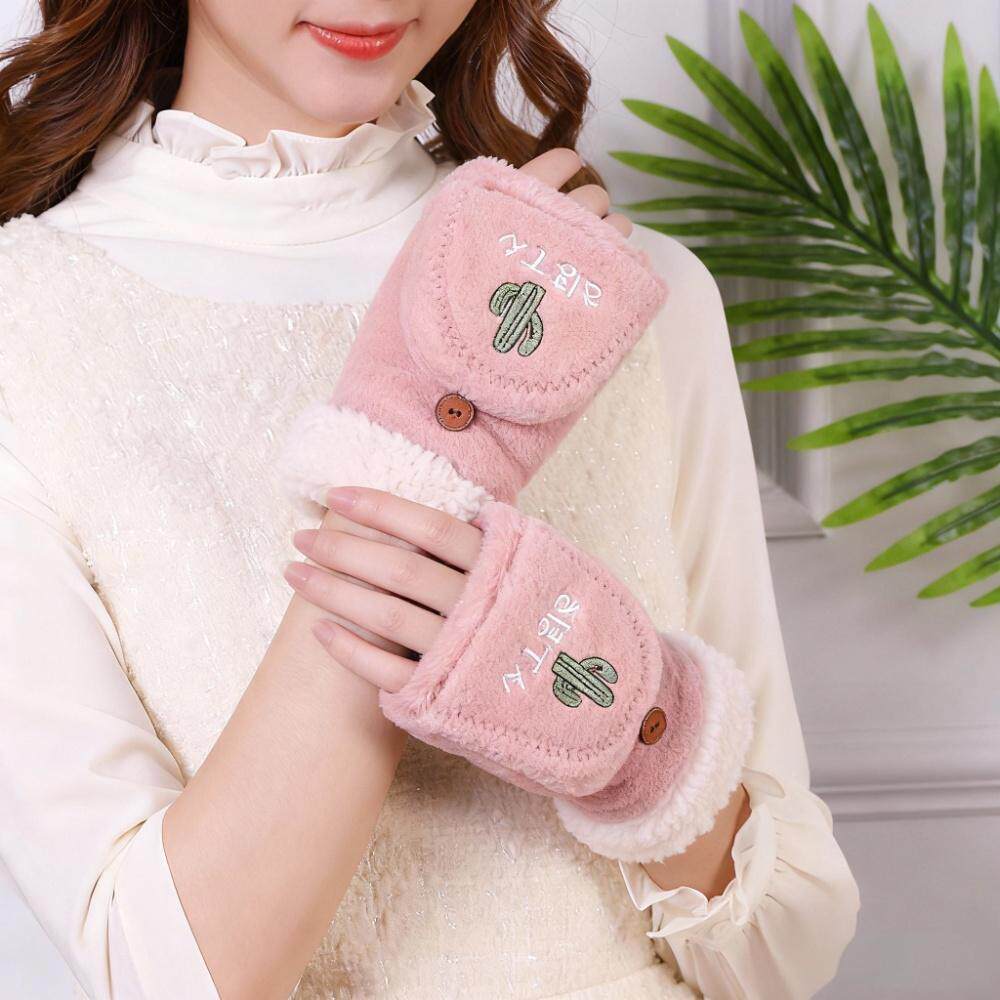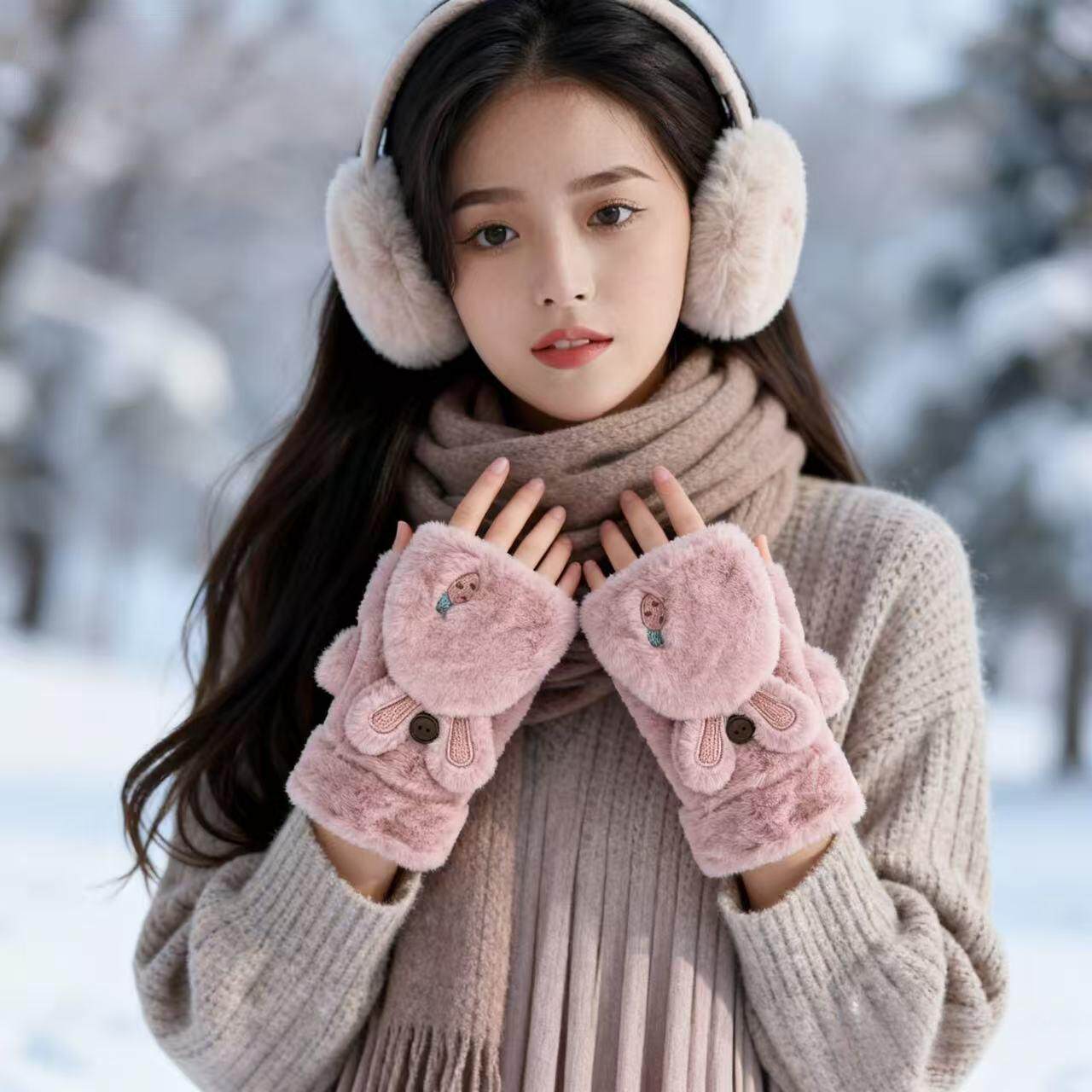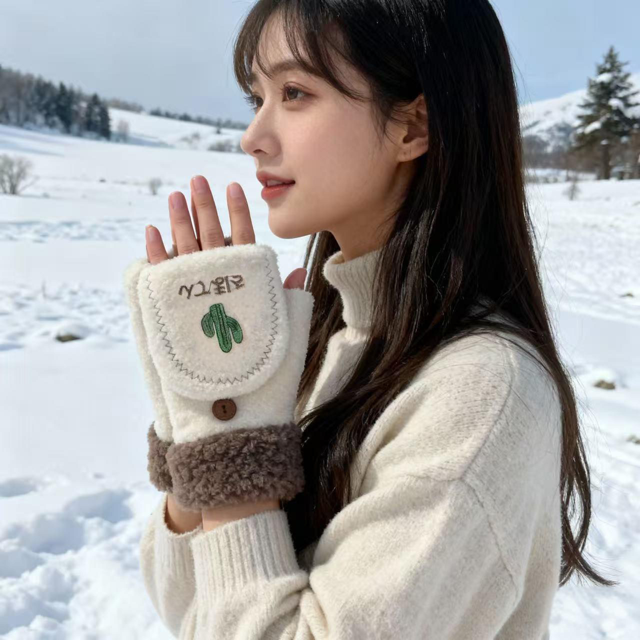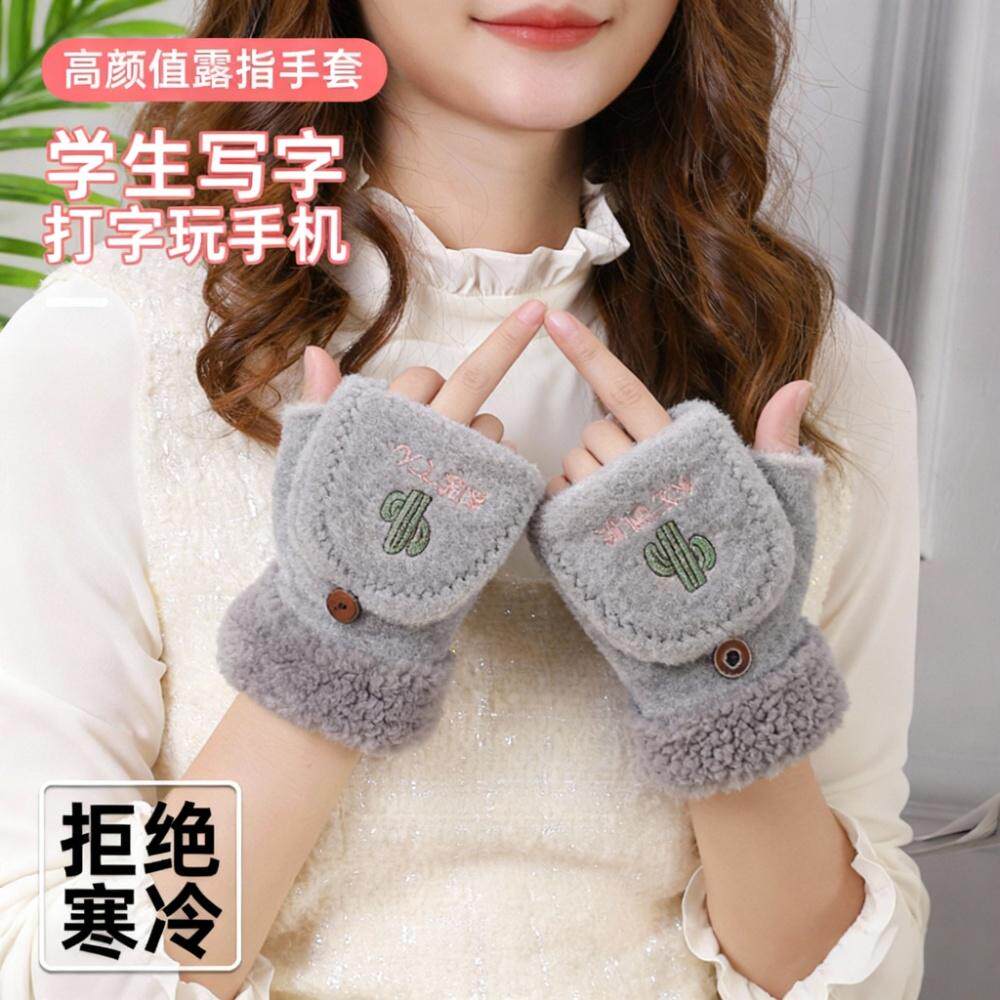 📚 冬季保暖韩版可爱学生两用翻盖半指手套女圣诞节礼物加绒露指手套