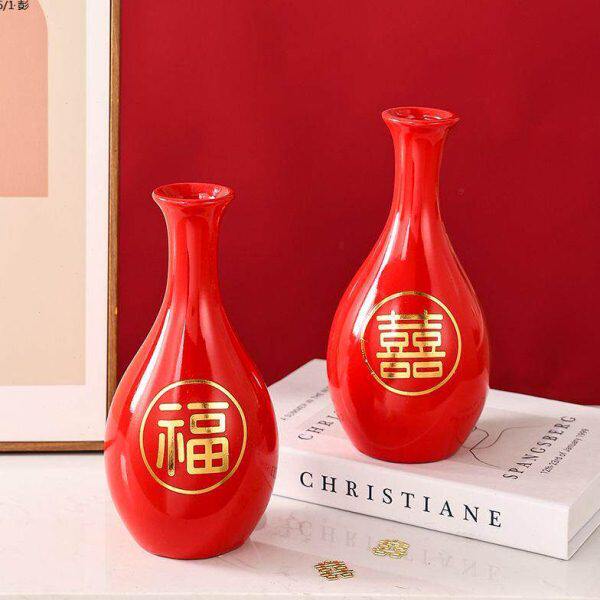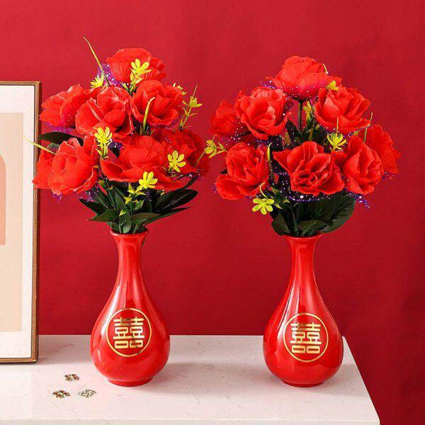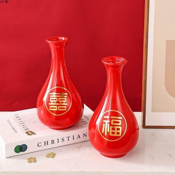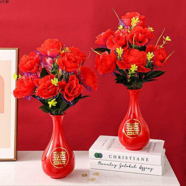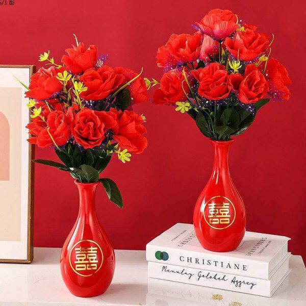 📚 花瓶客厅摆件陶瓷花瓶结婚婚房装饰喜字婚花束插花一对新娘红色新