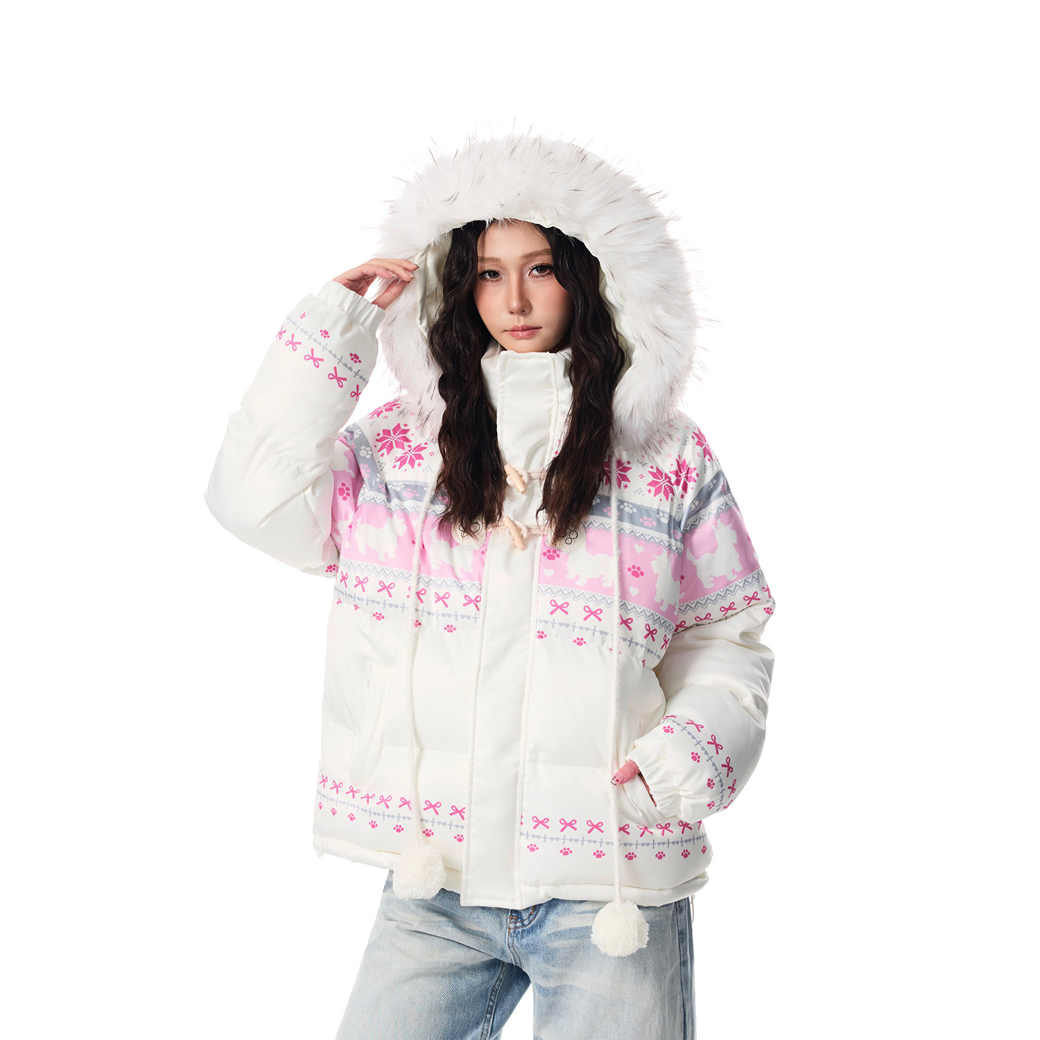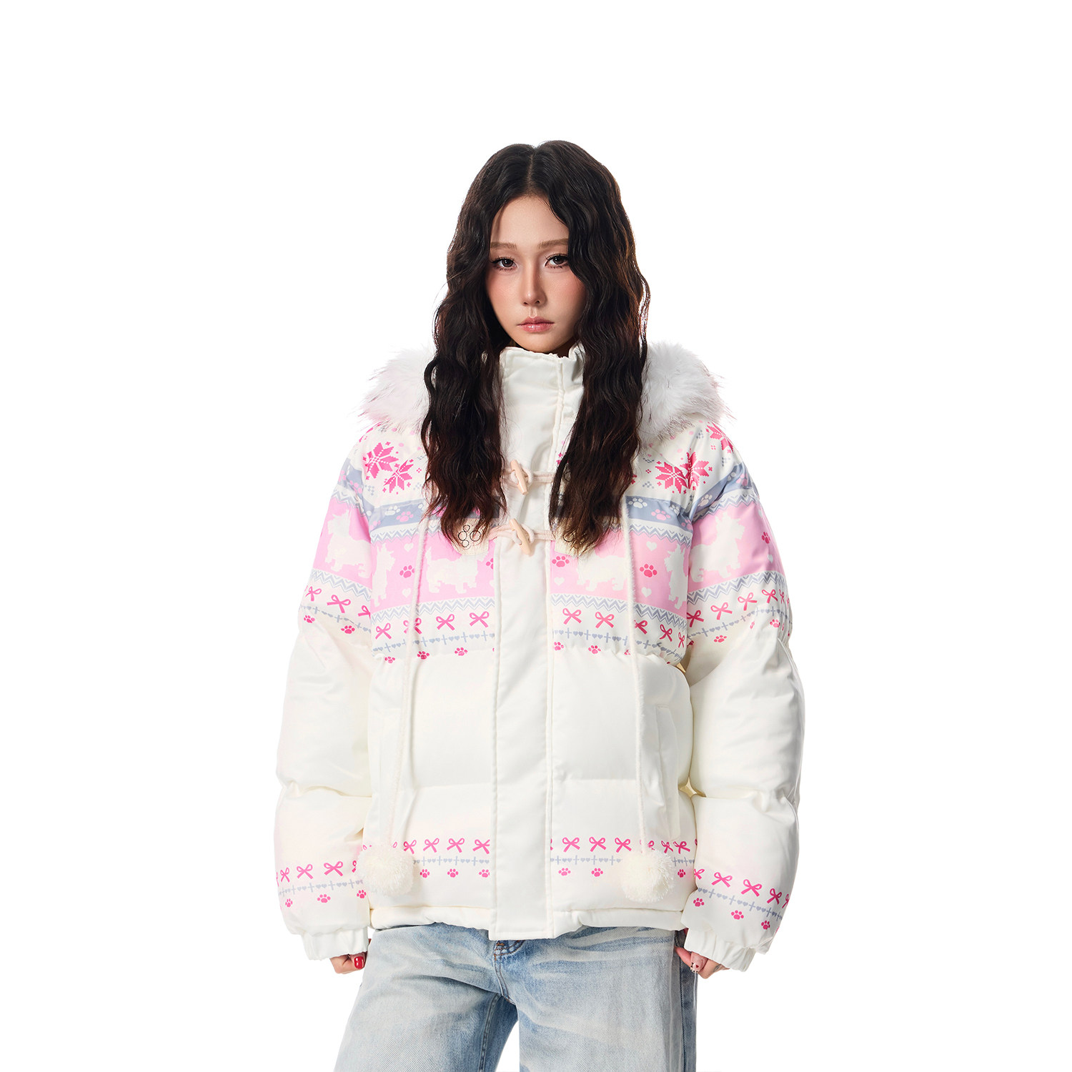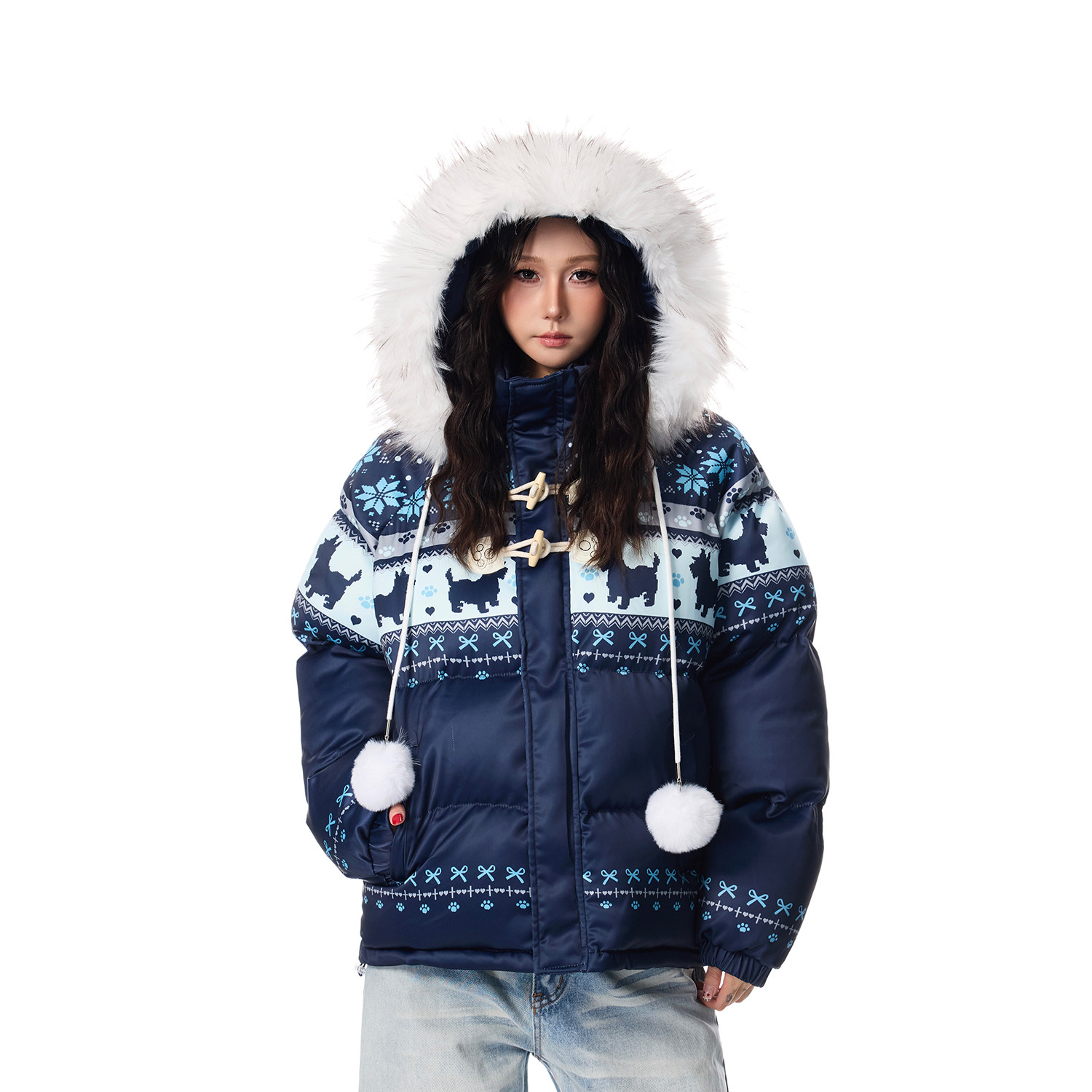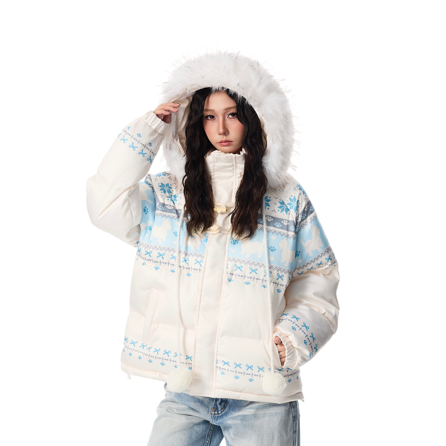 📚 SREK冬季新款费尔岛风毛领连帽棉服女冬季印花保暖宽松面包服外套
