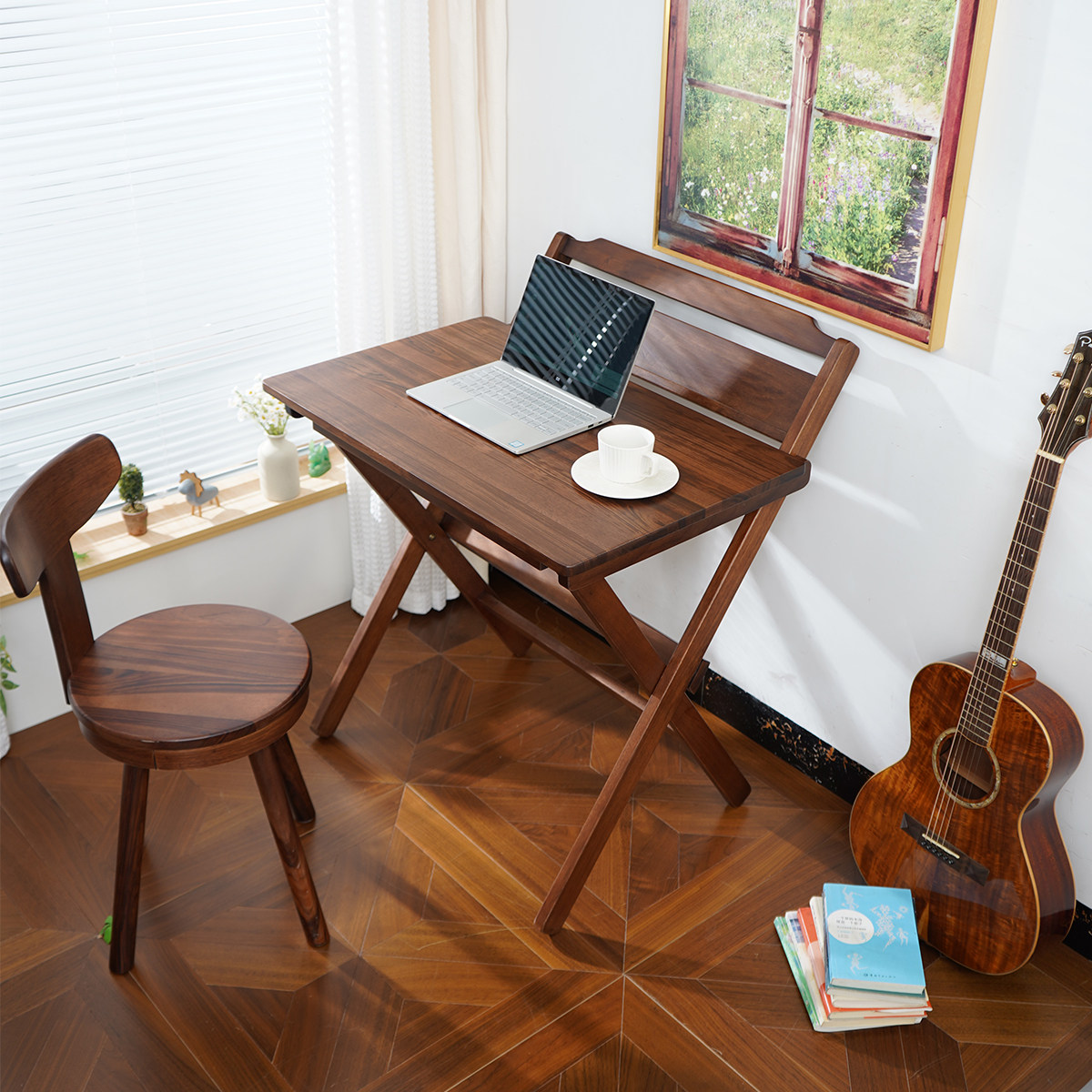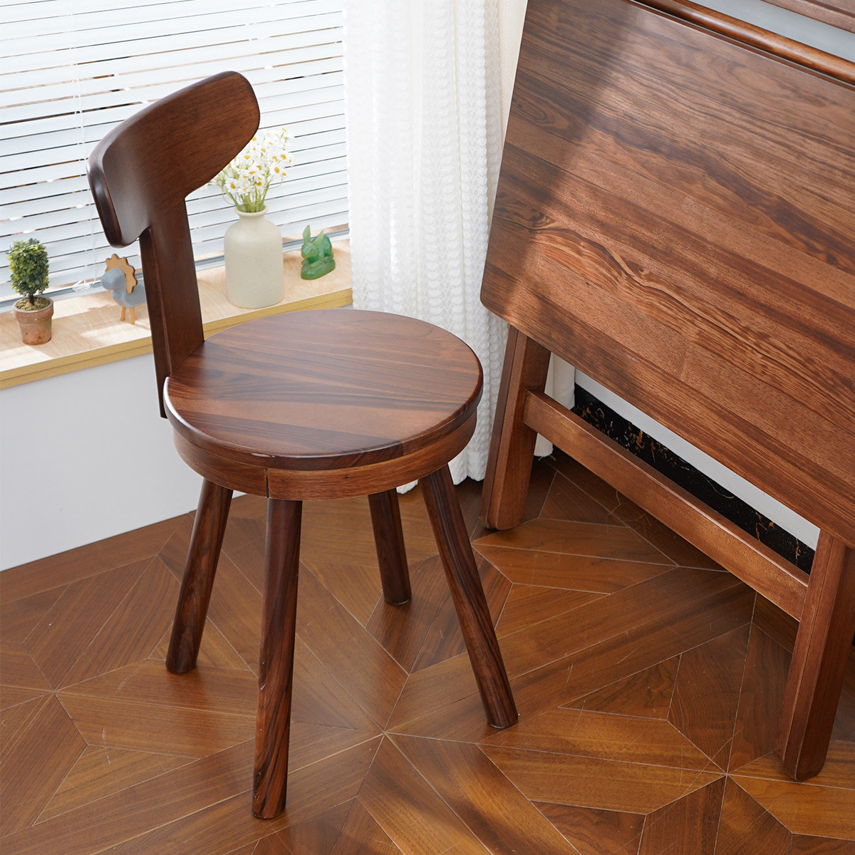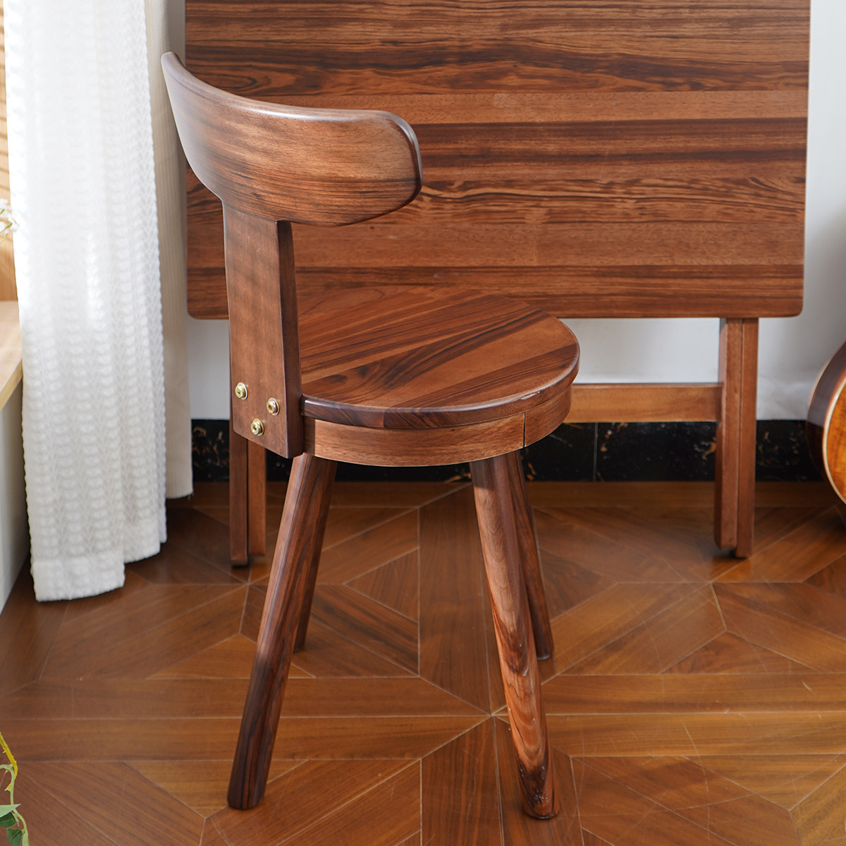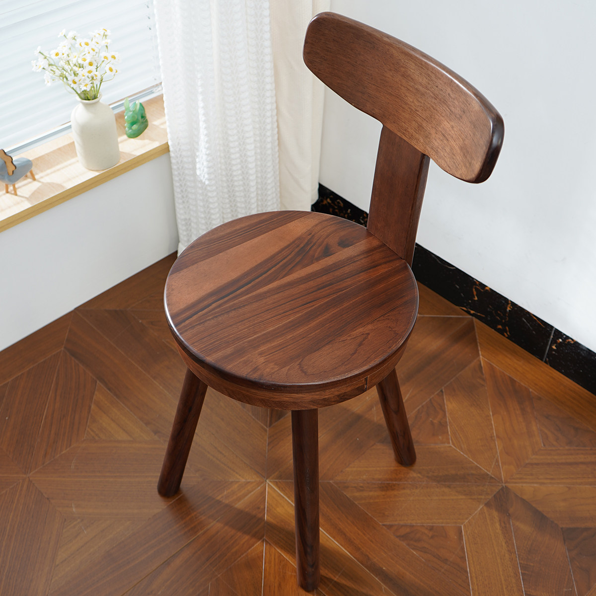 📚 胡桃木圆凳可旋转靠背椅子简约矮凳靠背椅长条书桌椅实木电脑椅