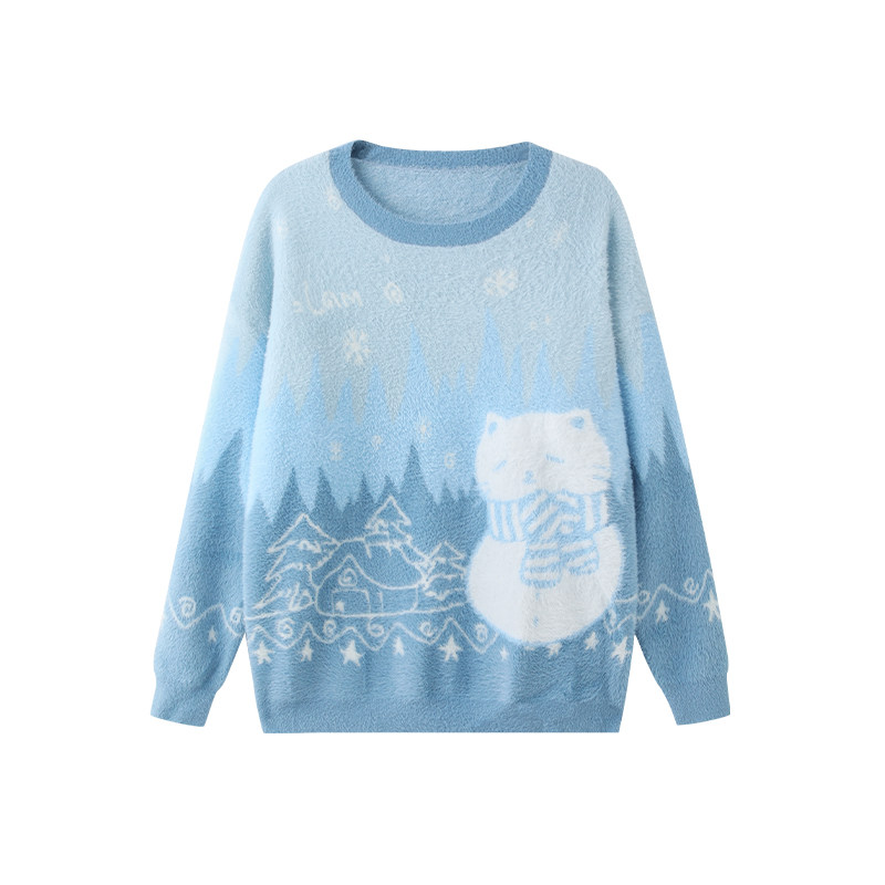 📚 LAMLICKA田嘉瑞同款蓝色可爱猫咪圆领毛衣男冬季宽松长袖针织衫女