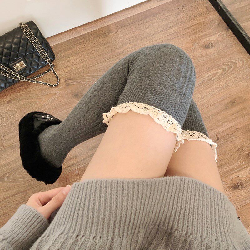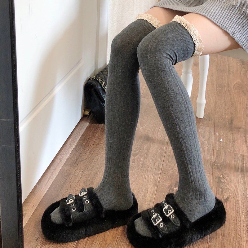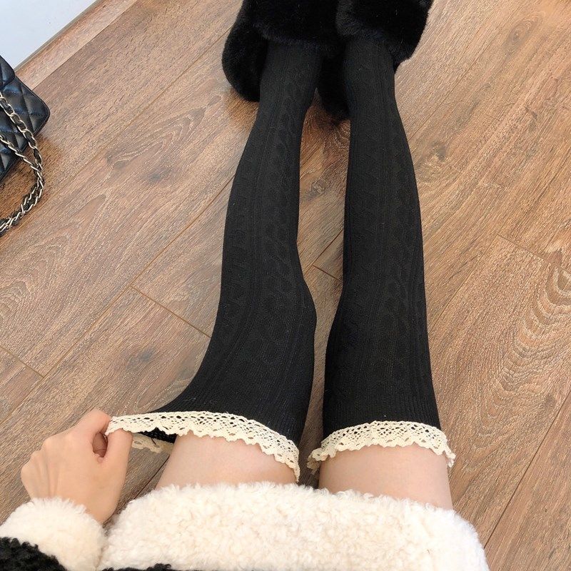 📚 蕾丝花边小腿袜女春秋款灰色过膝袜长筒袜子女秋冬黑色长袜配靴子