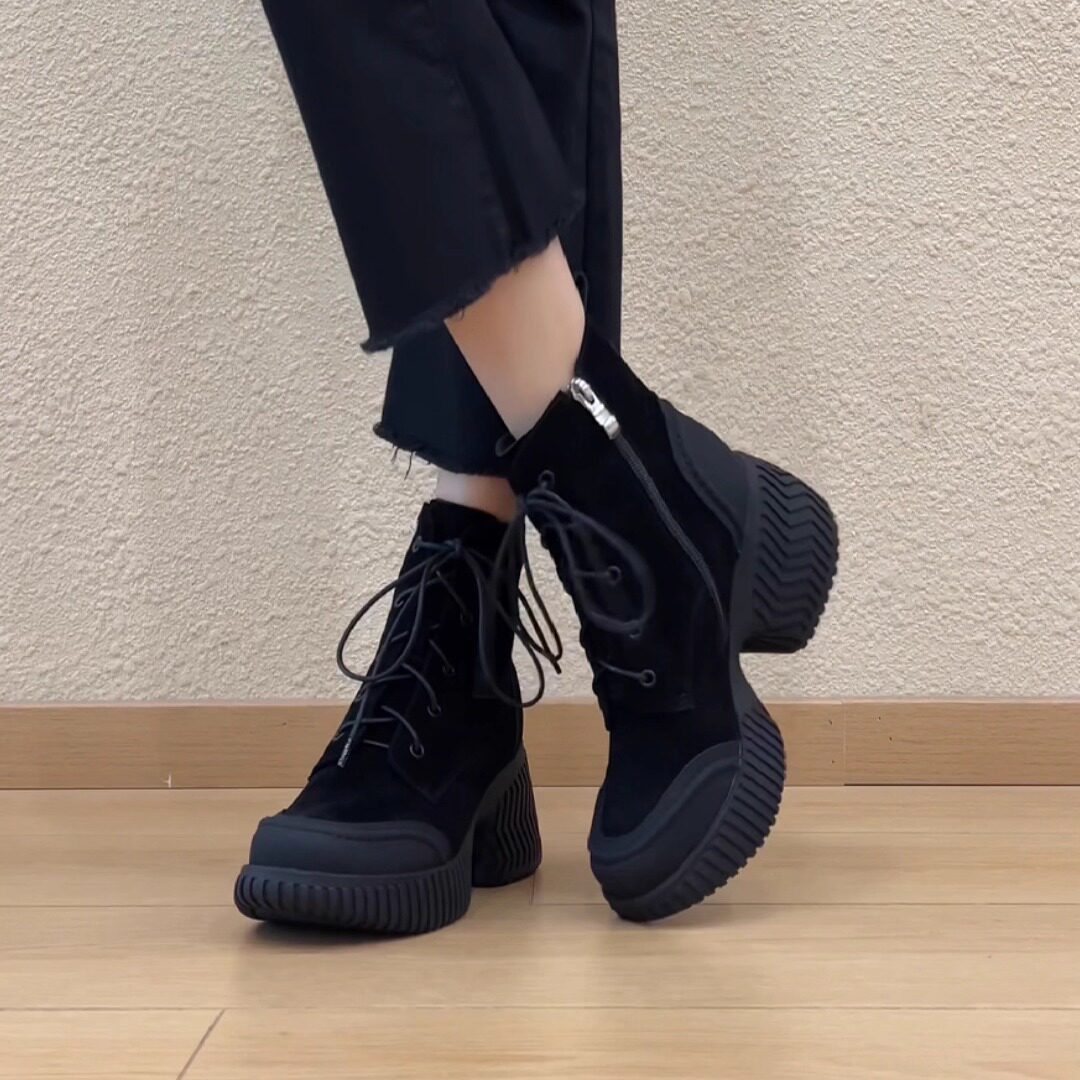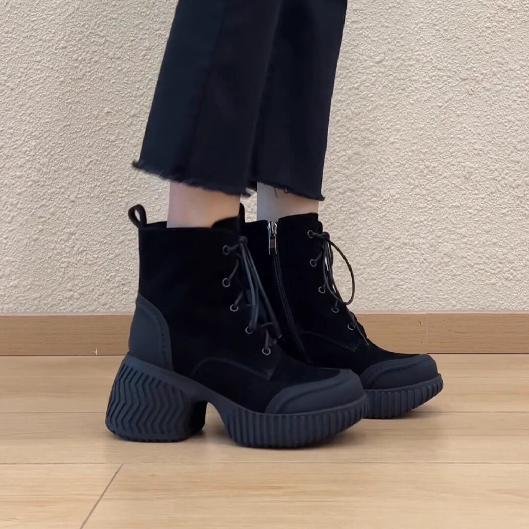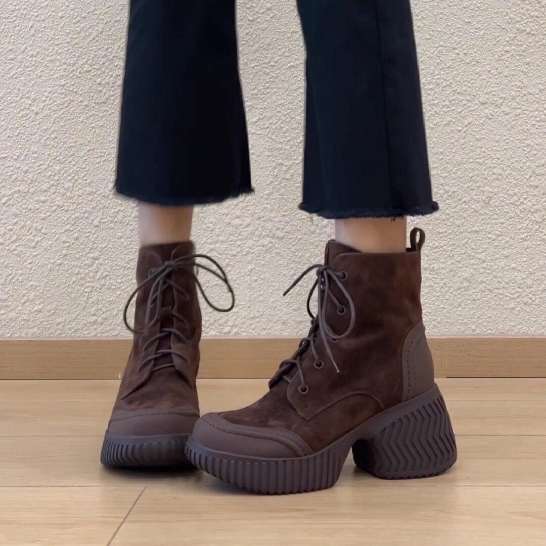📚 8cm增高厚底软羊皮小个子短靴秋冬款复古圆头侧拉链系带马丁靴女