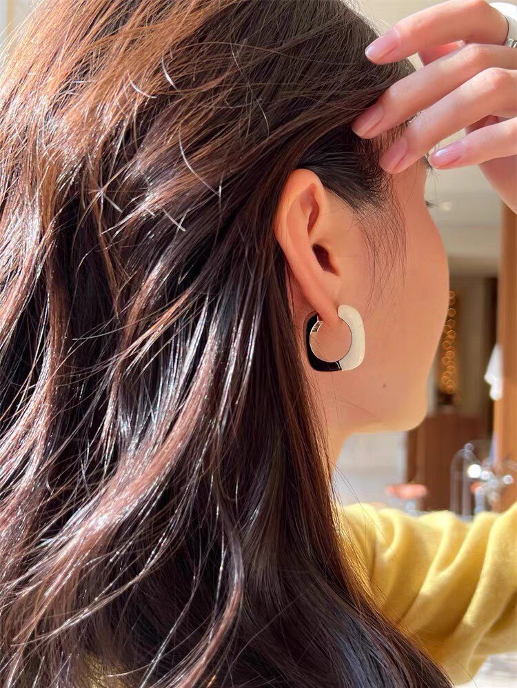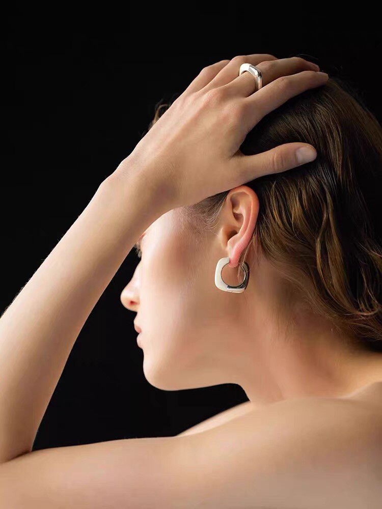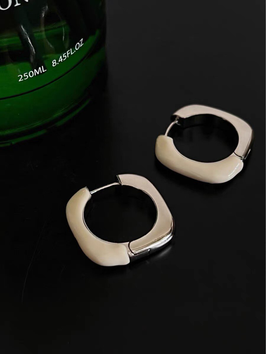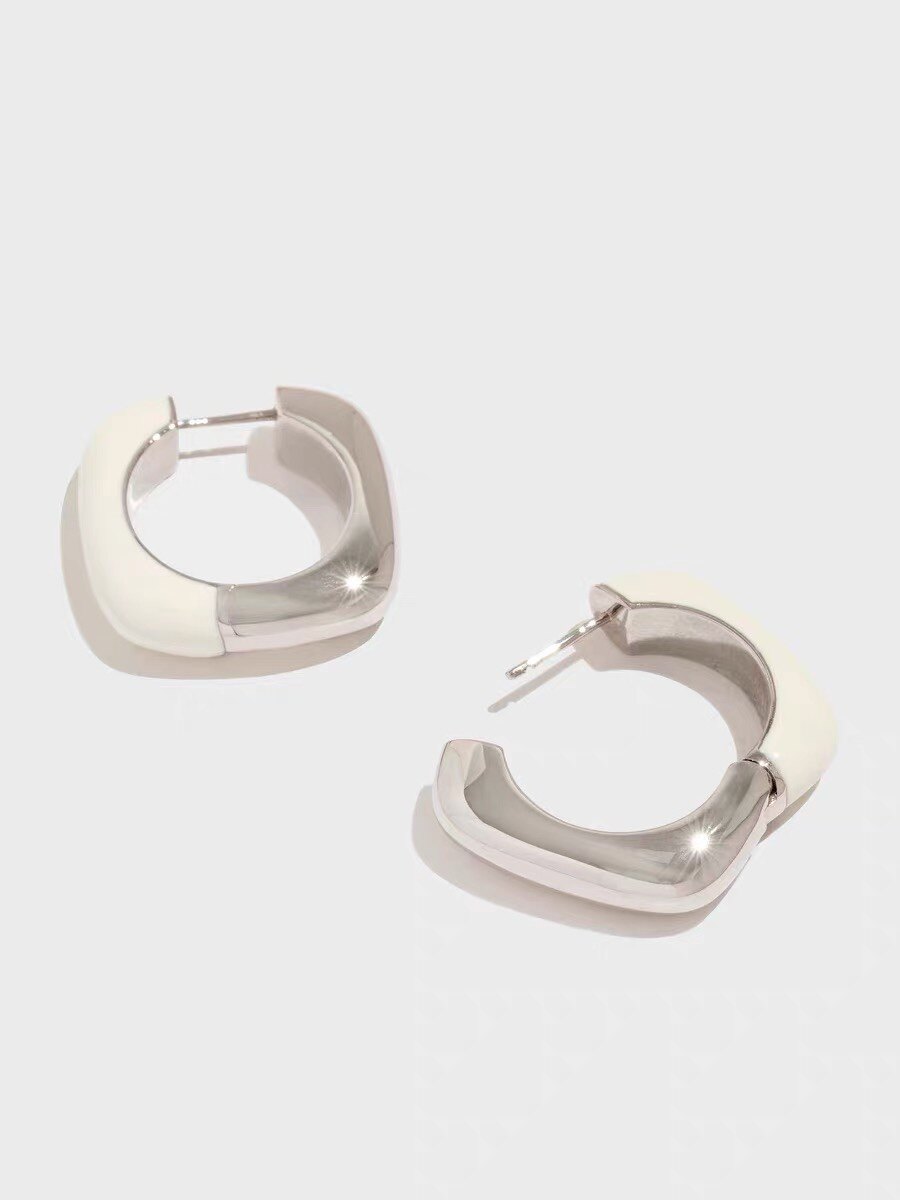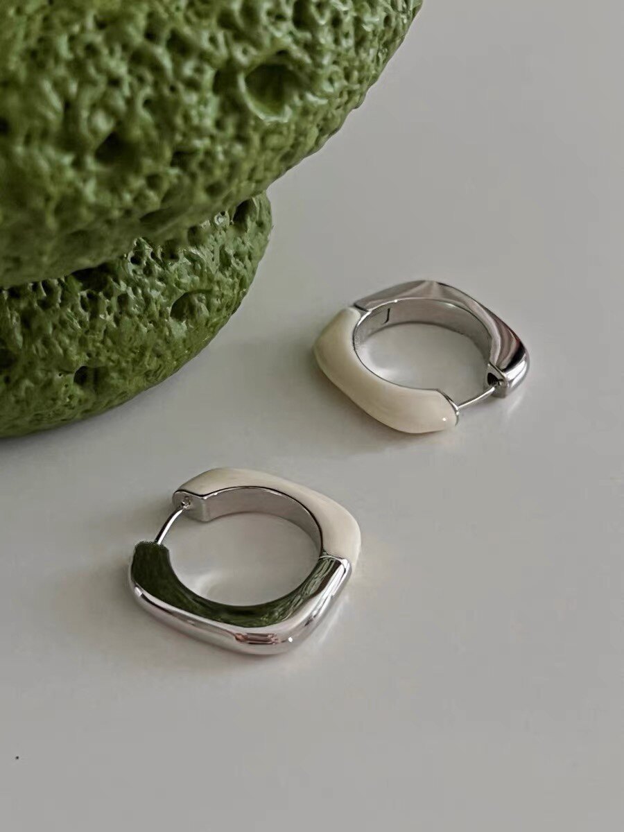 📚 豆豆推荐银色金属奶油白珐琅滴釉拼接几何方形耳环 个性时髦耳饰