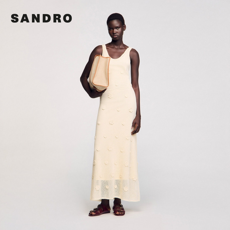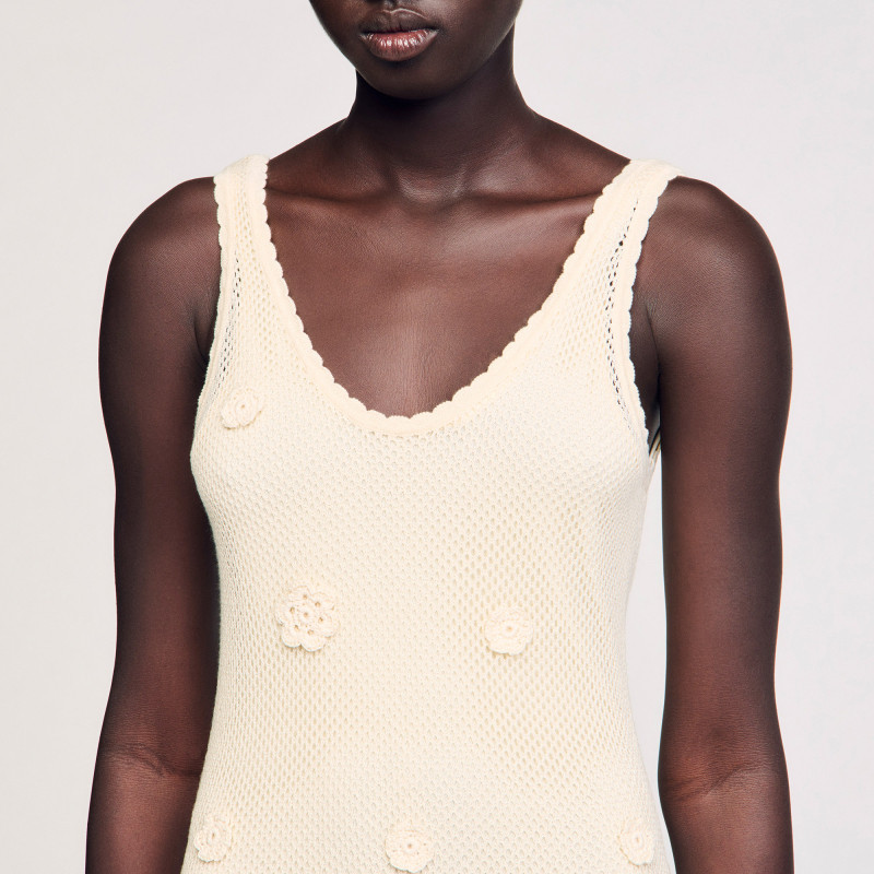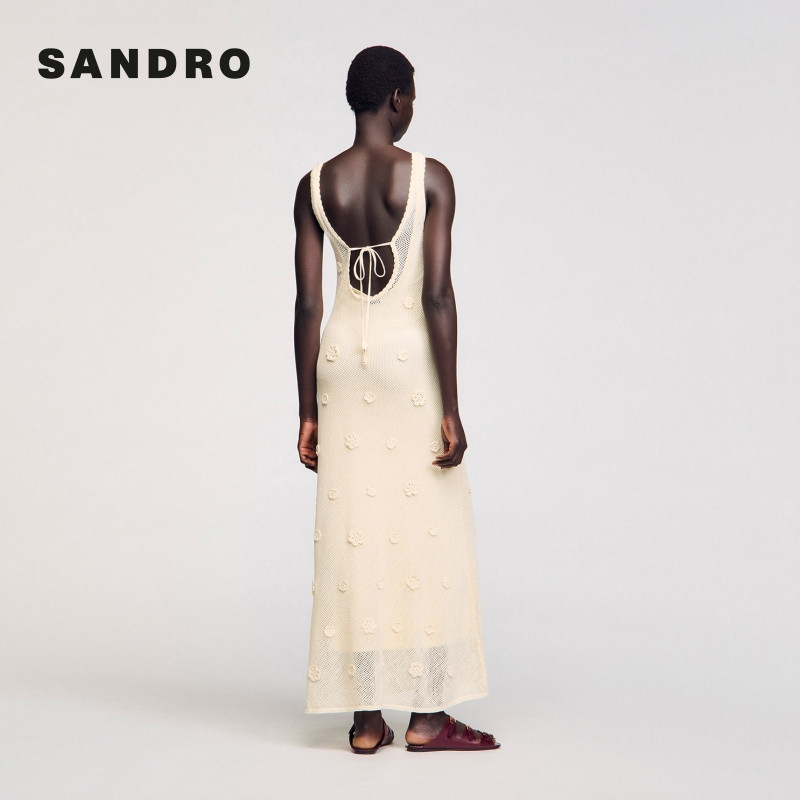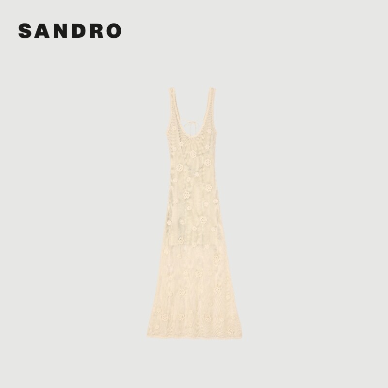 📚 SANDRO2025秋冬女装法式优雅米白色镂空花朵点缀吊带针织连衣裙