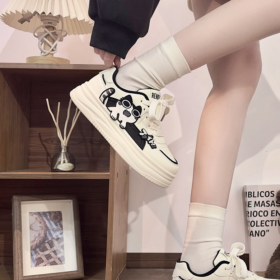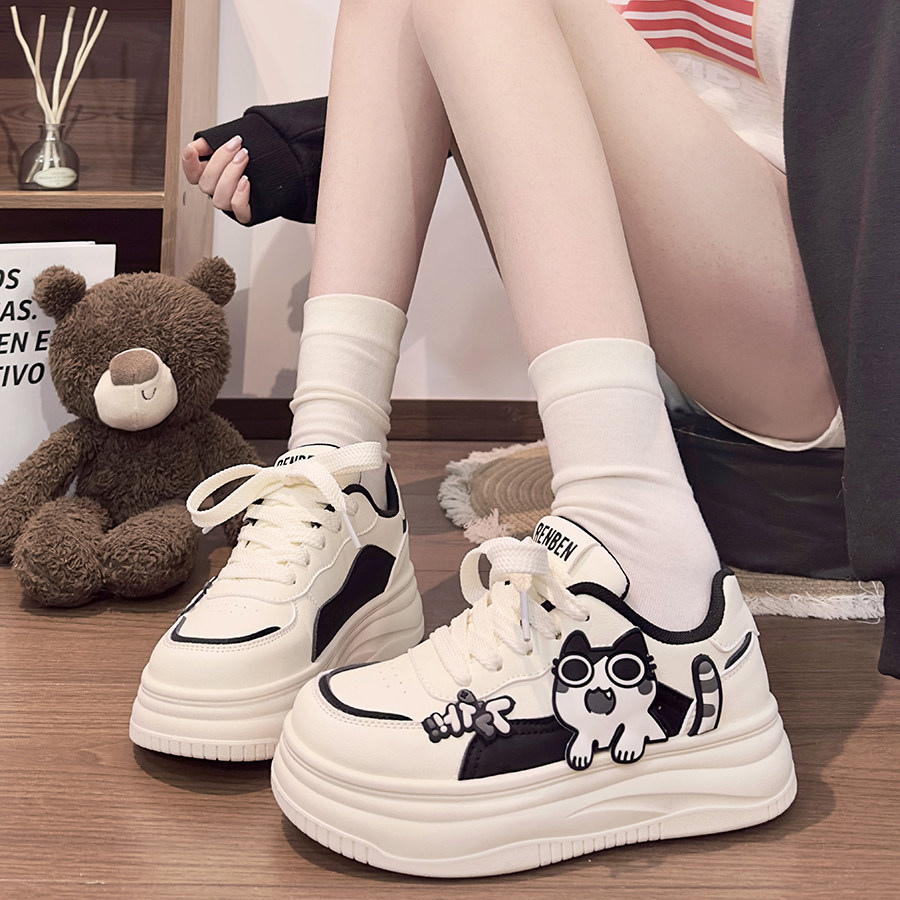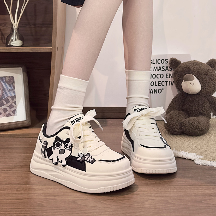 📚 人本黑白女鞋可爱小猫小白鞋女2026新款甜酷学生厚底增高韩版板鞋