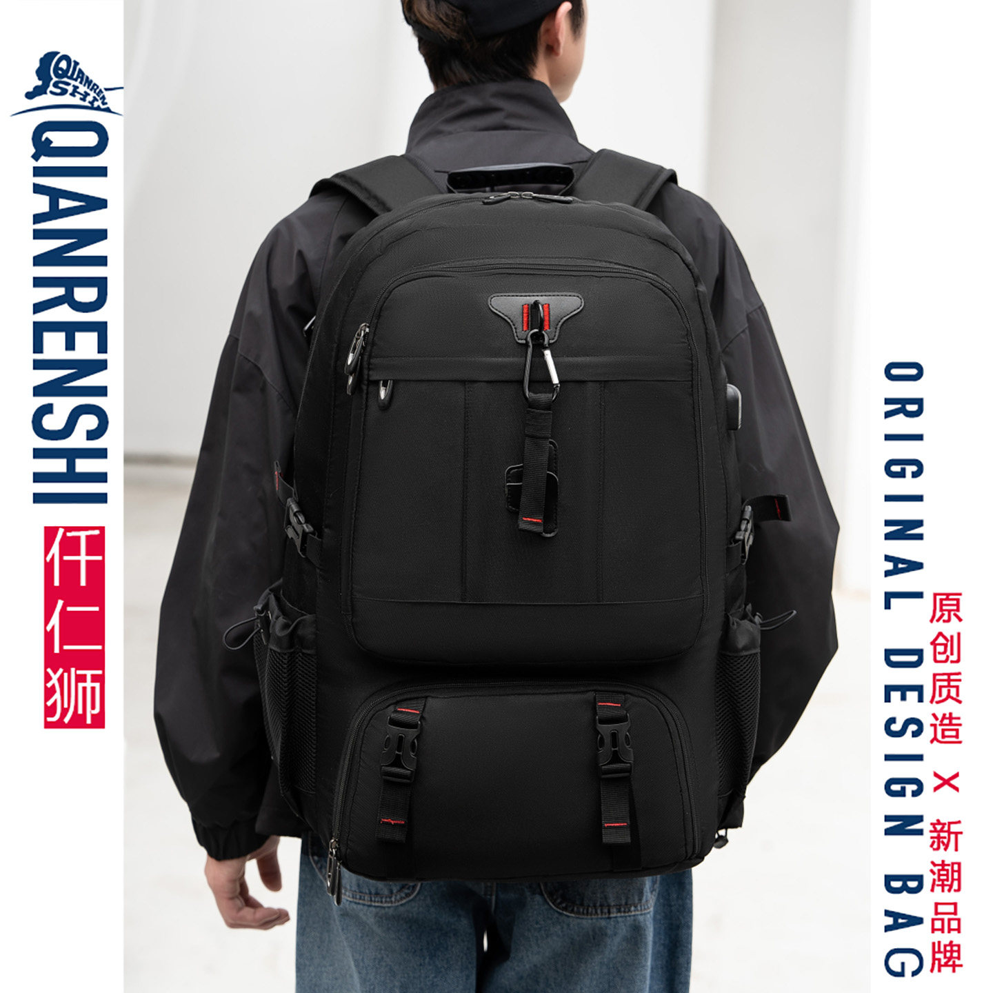 📚 可扩容的登机旅行包男大容量带充电插口多分区减负黑色双肩行李包