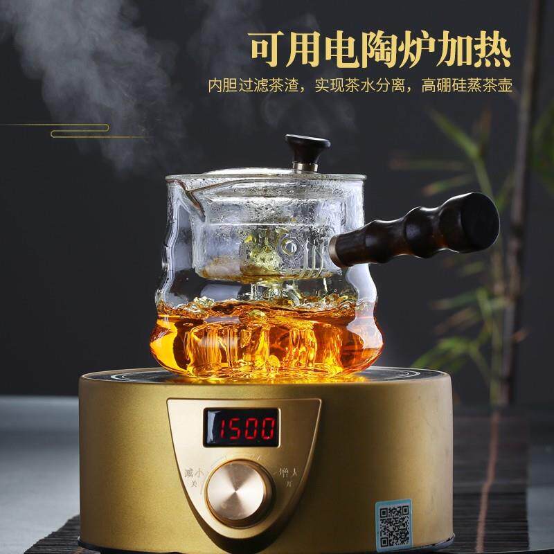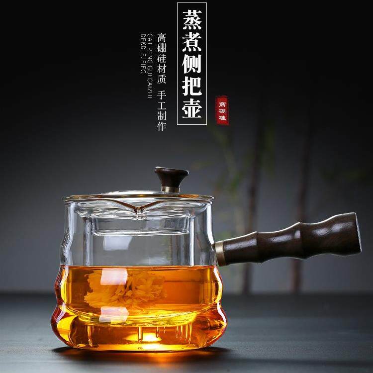 📚 透明玻璃木把茶壶带过滤蒸煮两用玻璃壶侧把玻璃泡茶器