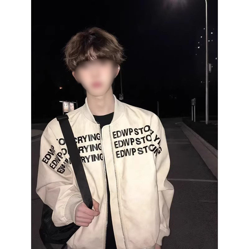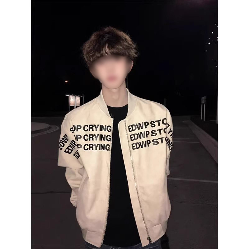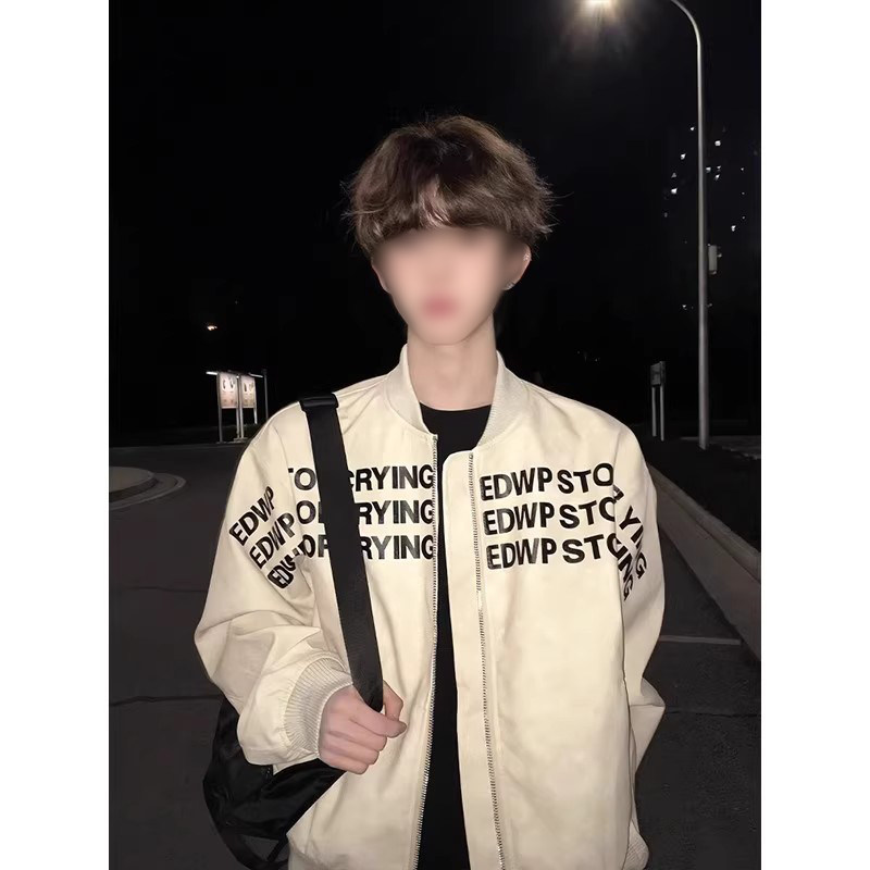 📚 字母印花美式棒球服男秋季高级感痞帅宽松立领pu皮衣飞行夹克外套