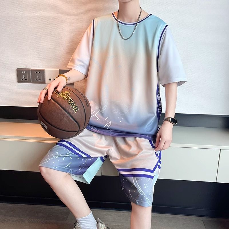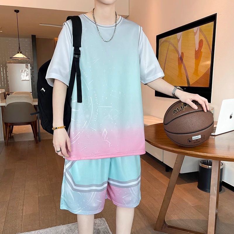 📚 夏季篮球服套装男生初中生冰丝速干短袖t恤青少年大童假两件球衣
