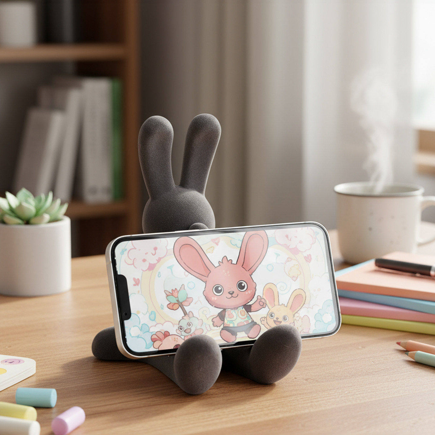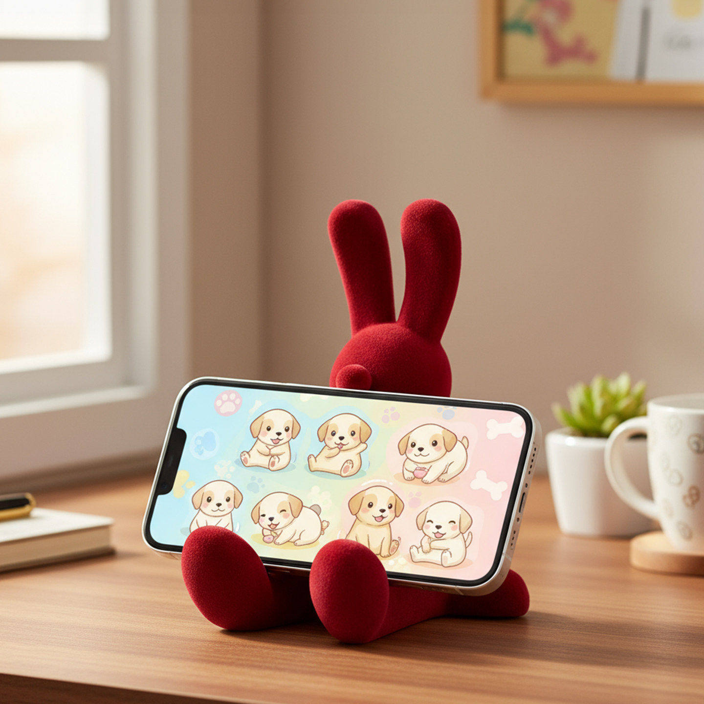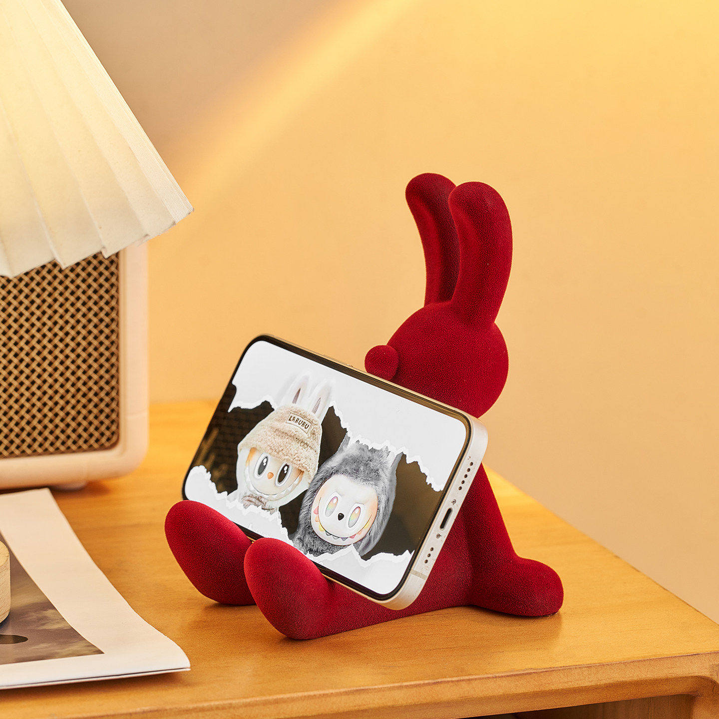 📚 红色植绒兔子坐姿摆件可爱桌面手机支架轻奢高档办公室工位装饰品