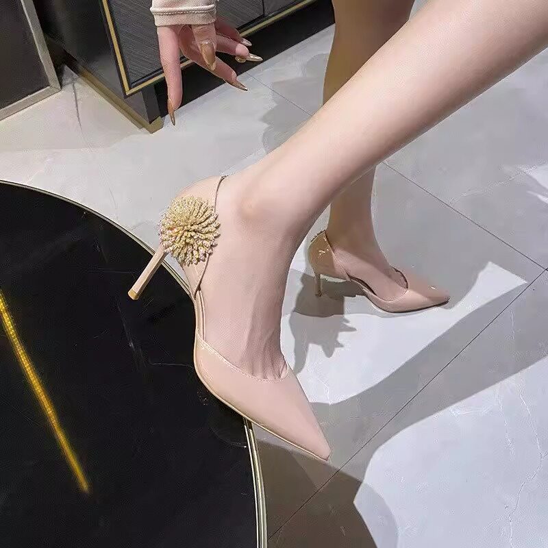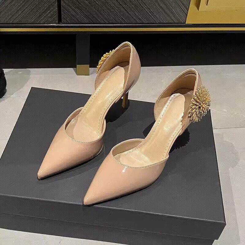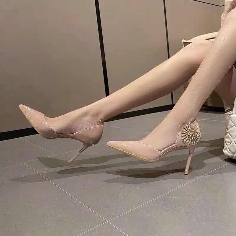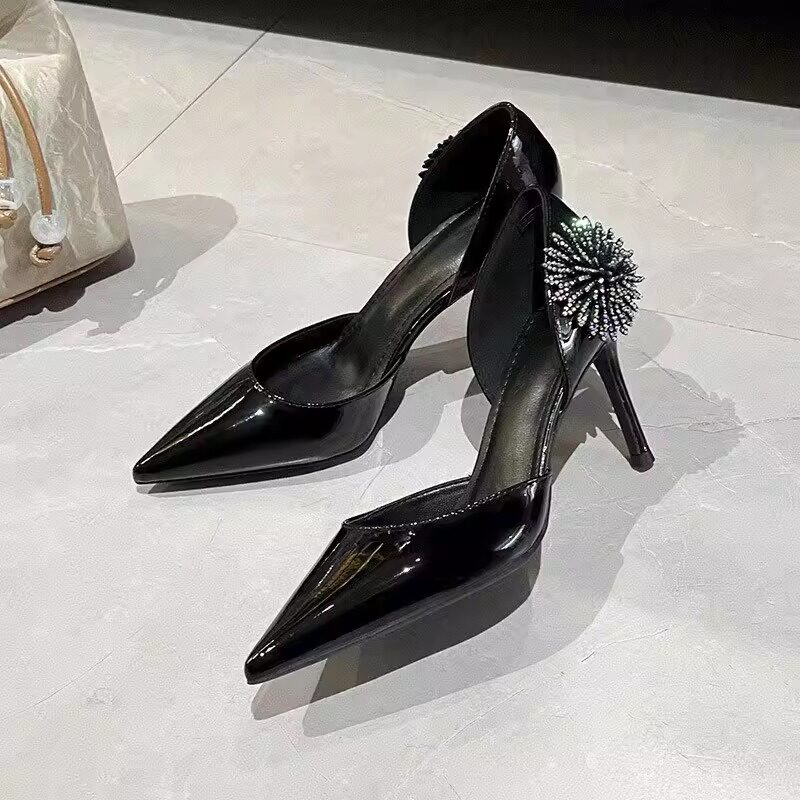 📚 2026春季新款高跟鞋细跟尖头浅口水晶花朵中空侧空时尚漆皮单鞋女