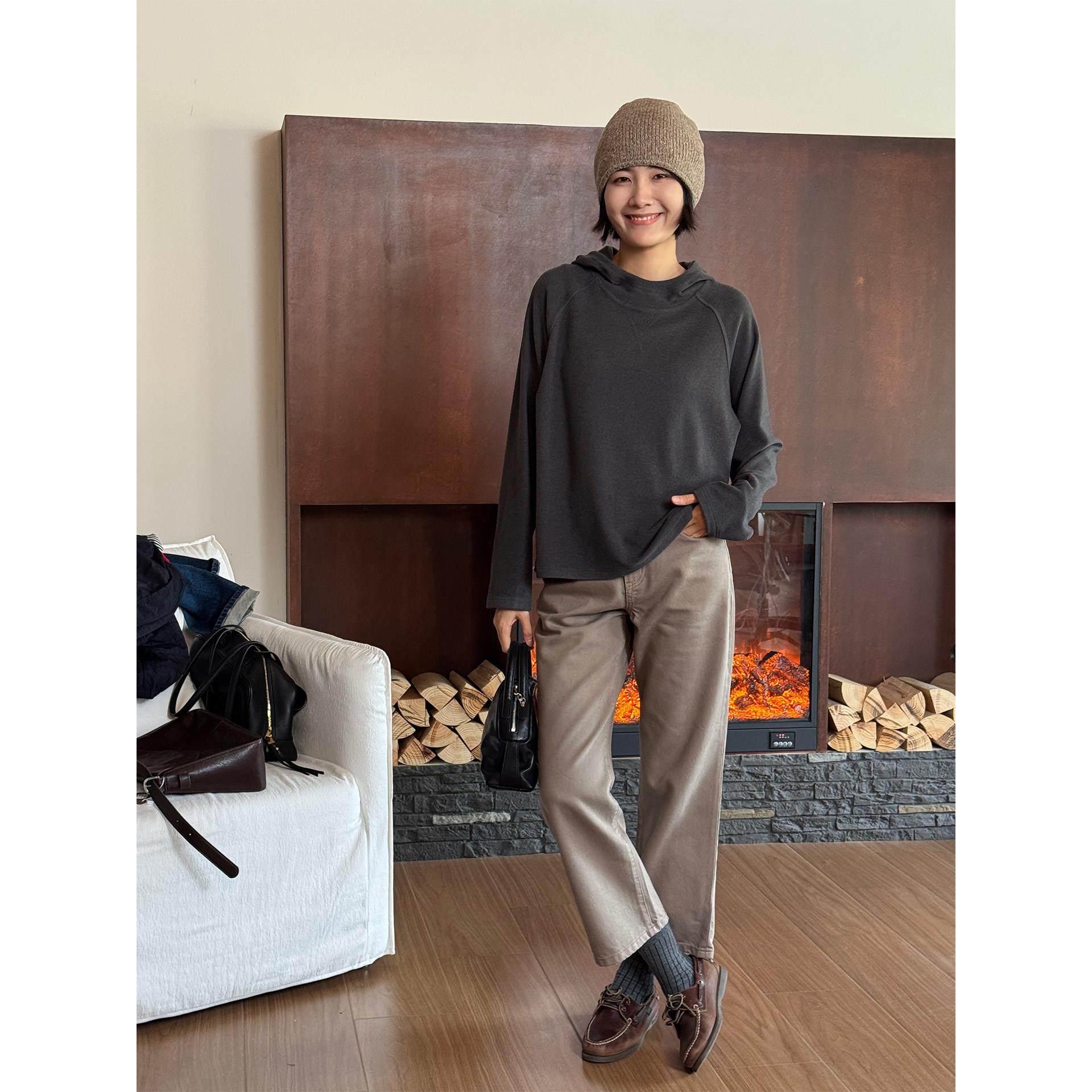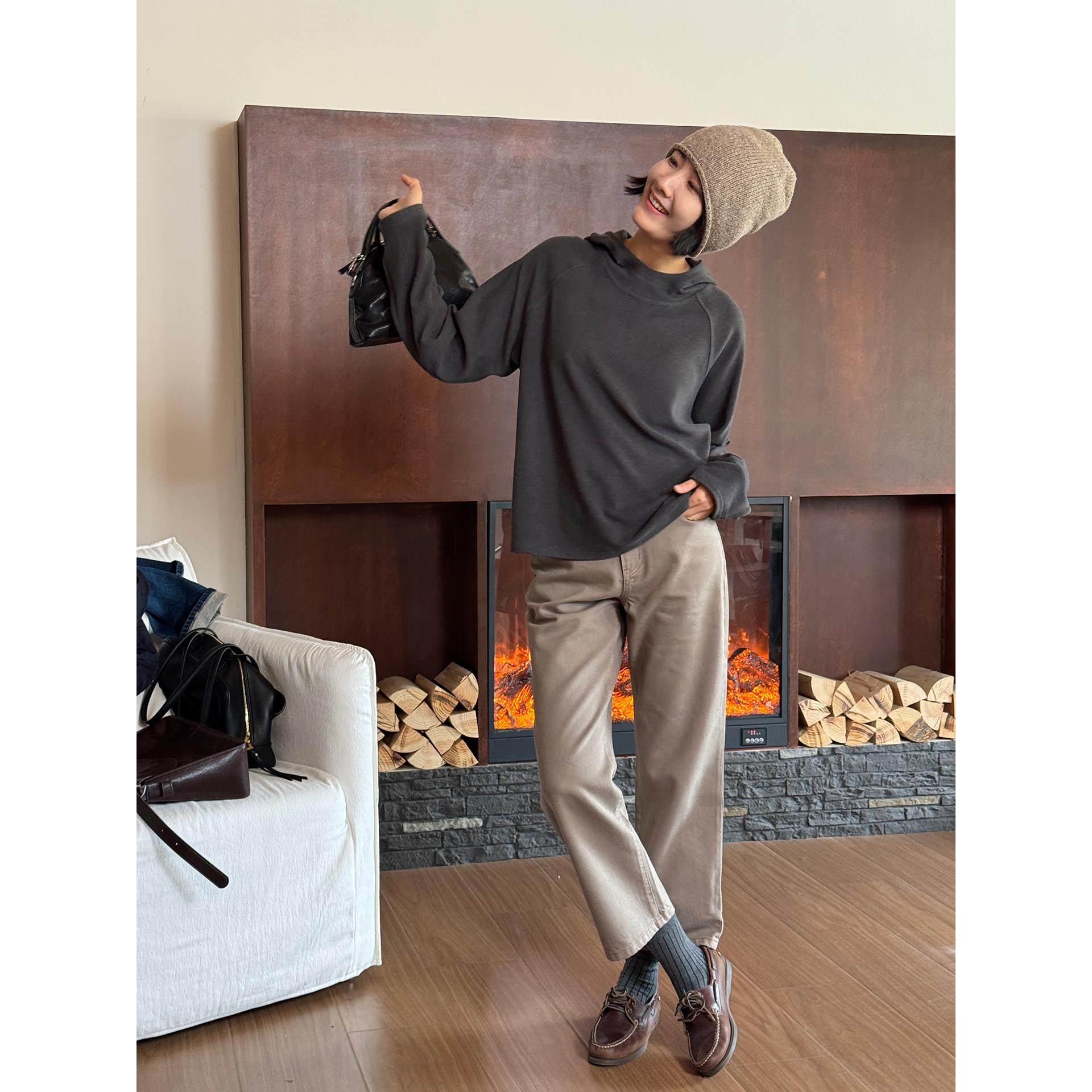 📚 周浪清灰色长袖连帽卫衣女2025年新款秋装小个子宽松套头帽衫上衣