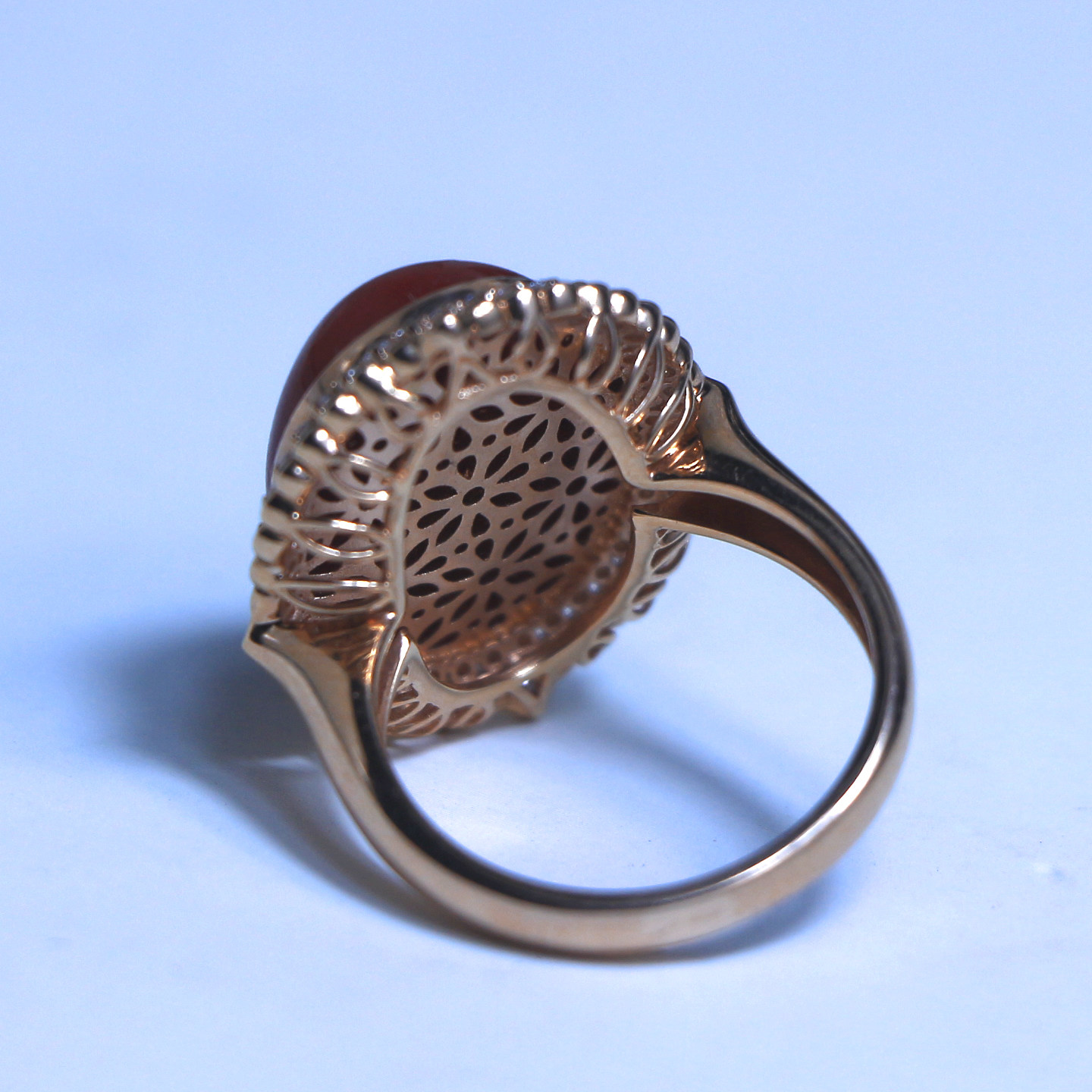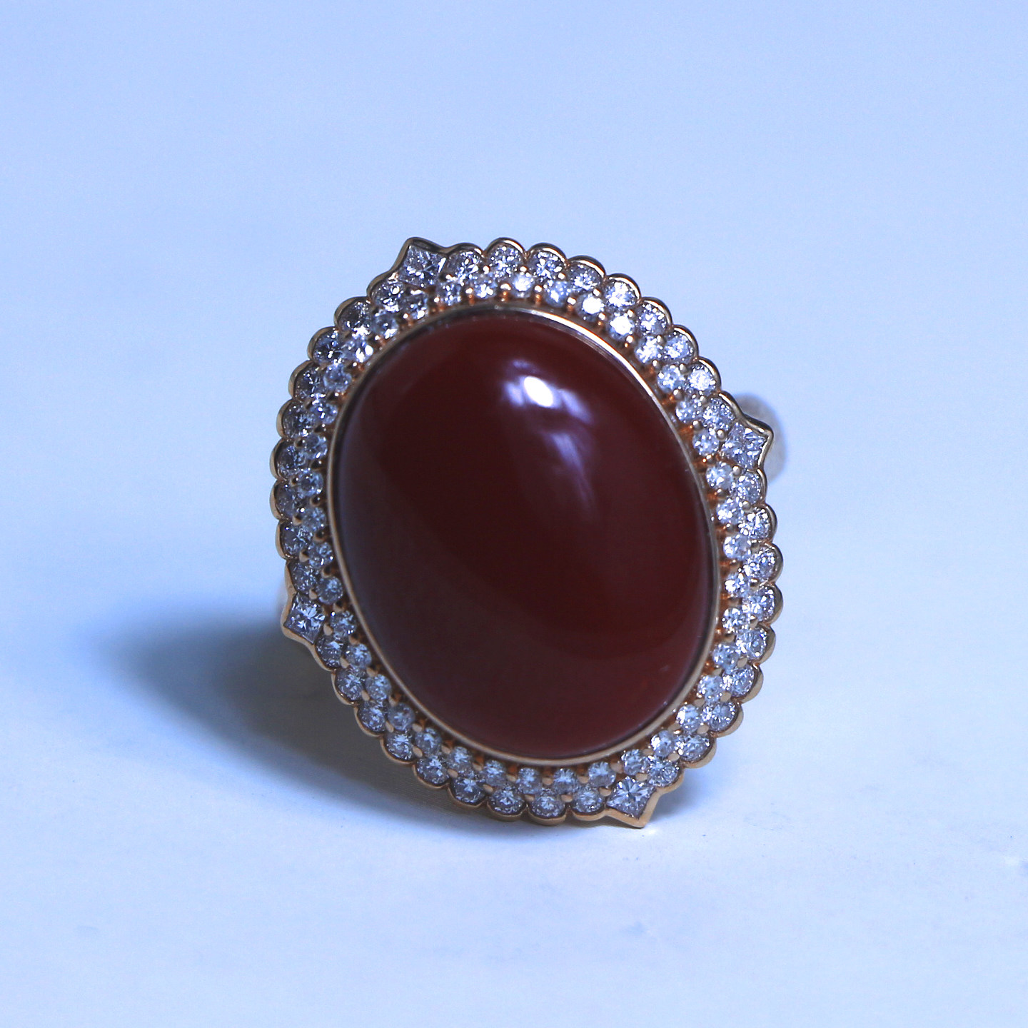 📚 天然阿卡赤血红珊瑚大蛋面戒指18K玫瑰金钻石镶嵌豪镶
