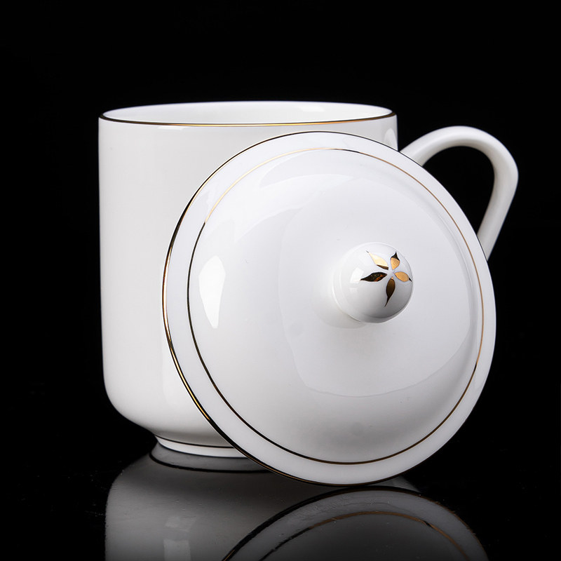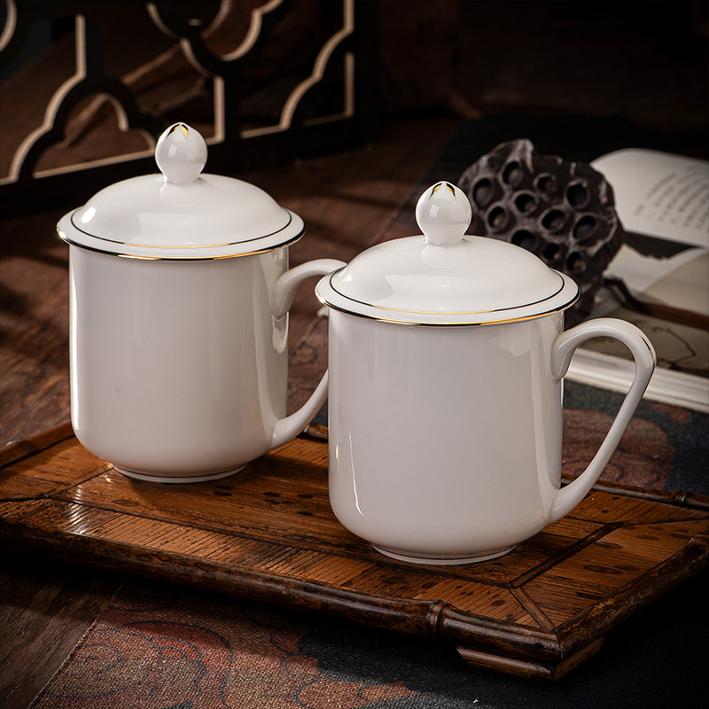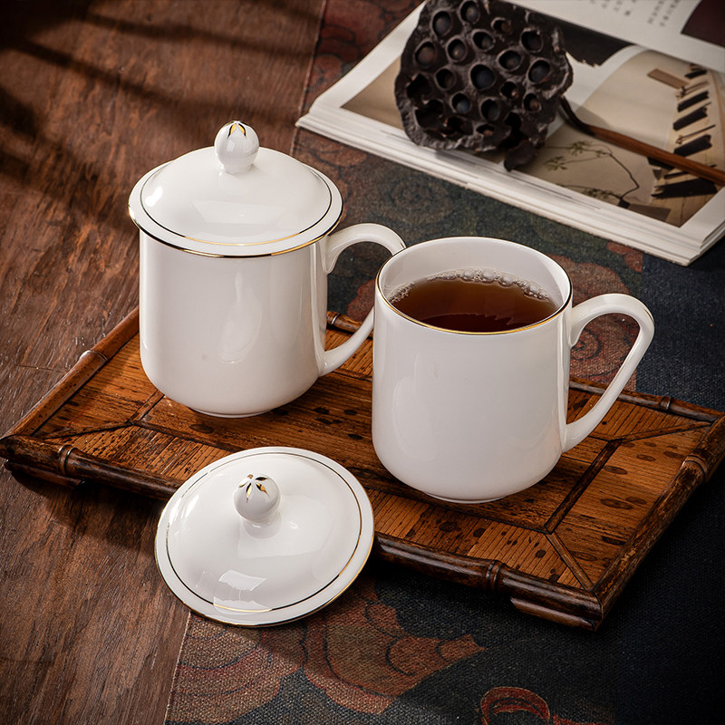 📚 陶瓷茶杯带盖子骨瓷纯白水杯办公室小容量会议杯子可定制LGOO刻字