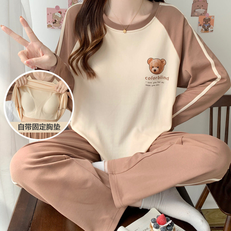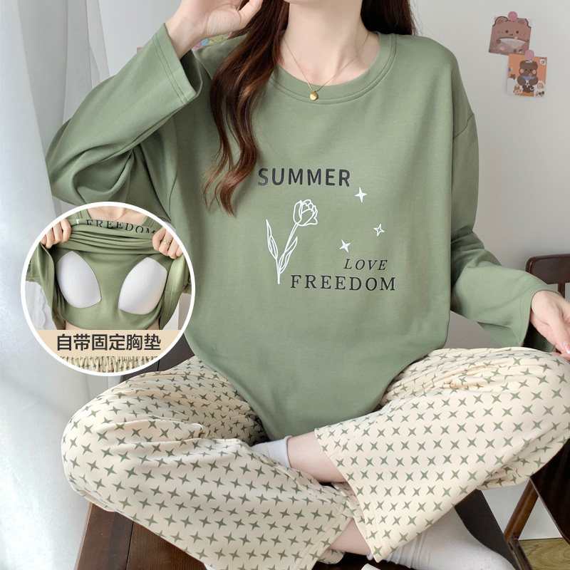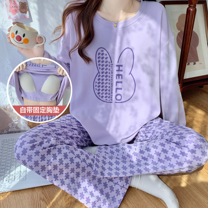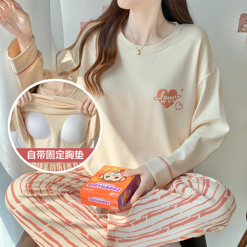 📚 全棉带胸垫睡衣春秋女款纯棉长袖绝美可外穿条纹家居服套装秋冬季