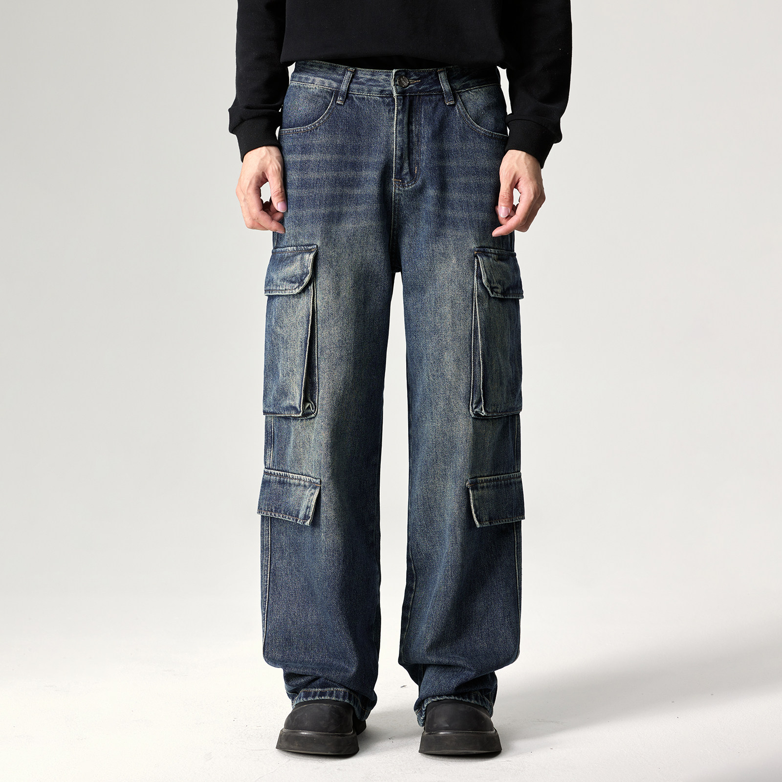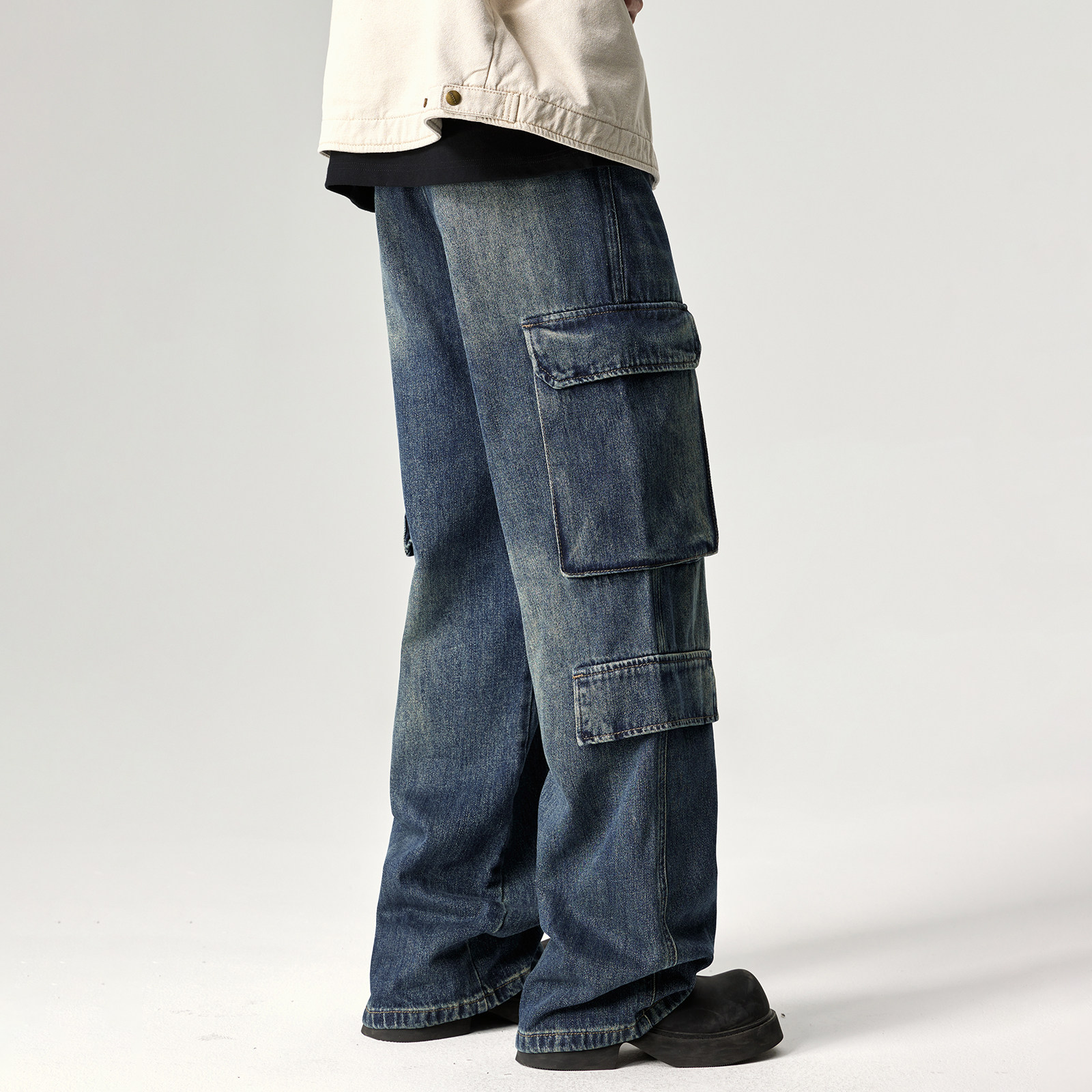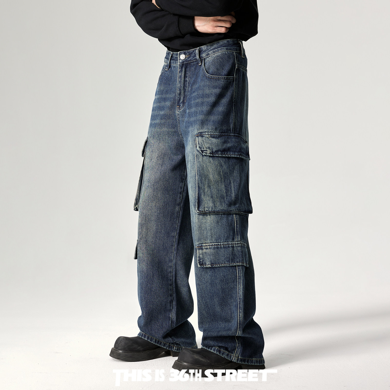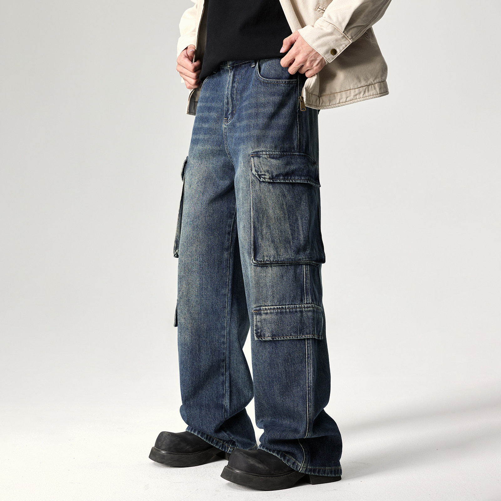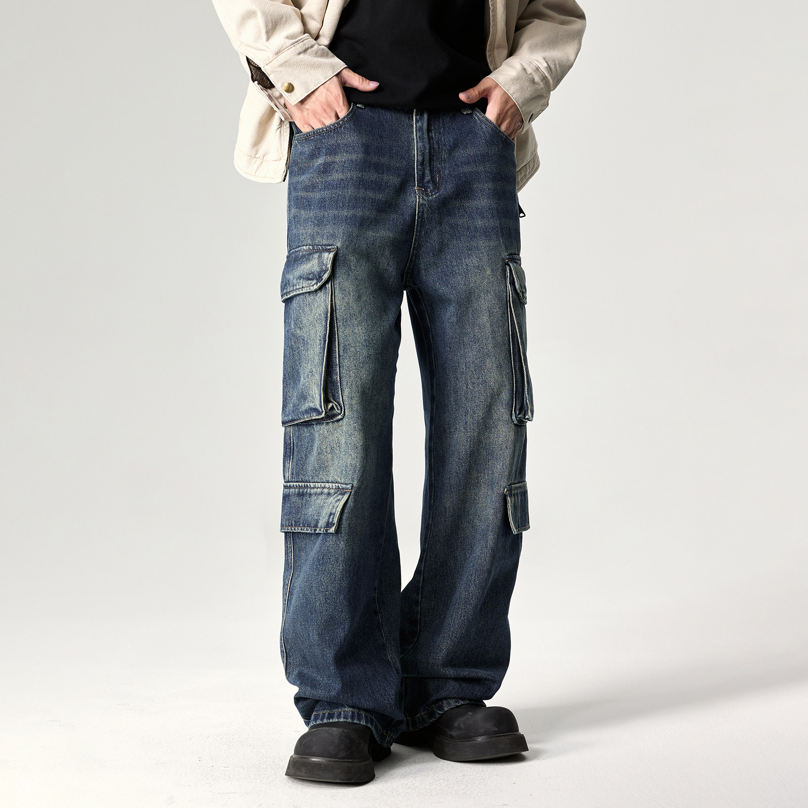 📚 美式重磅水洗做旧工装牛仔裤男宽松多口袋休闲裤高街潮牌阔腿裤子