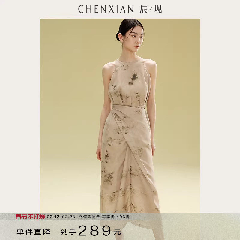 📚 【到手289元】水墨印染国风围裹式挂脖背心裙露肩新中式连衣裙女