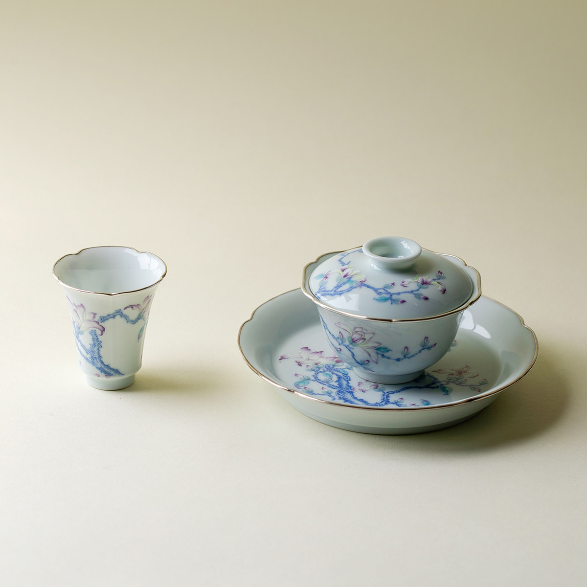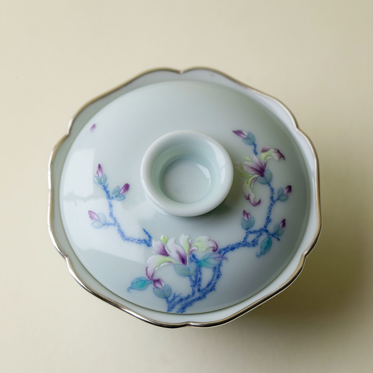 📚 梵汝手绘青花斗彩玉兰花花口盖碗包银口景德镇全手工胎粉彩泡茶碗