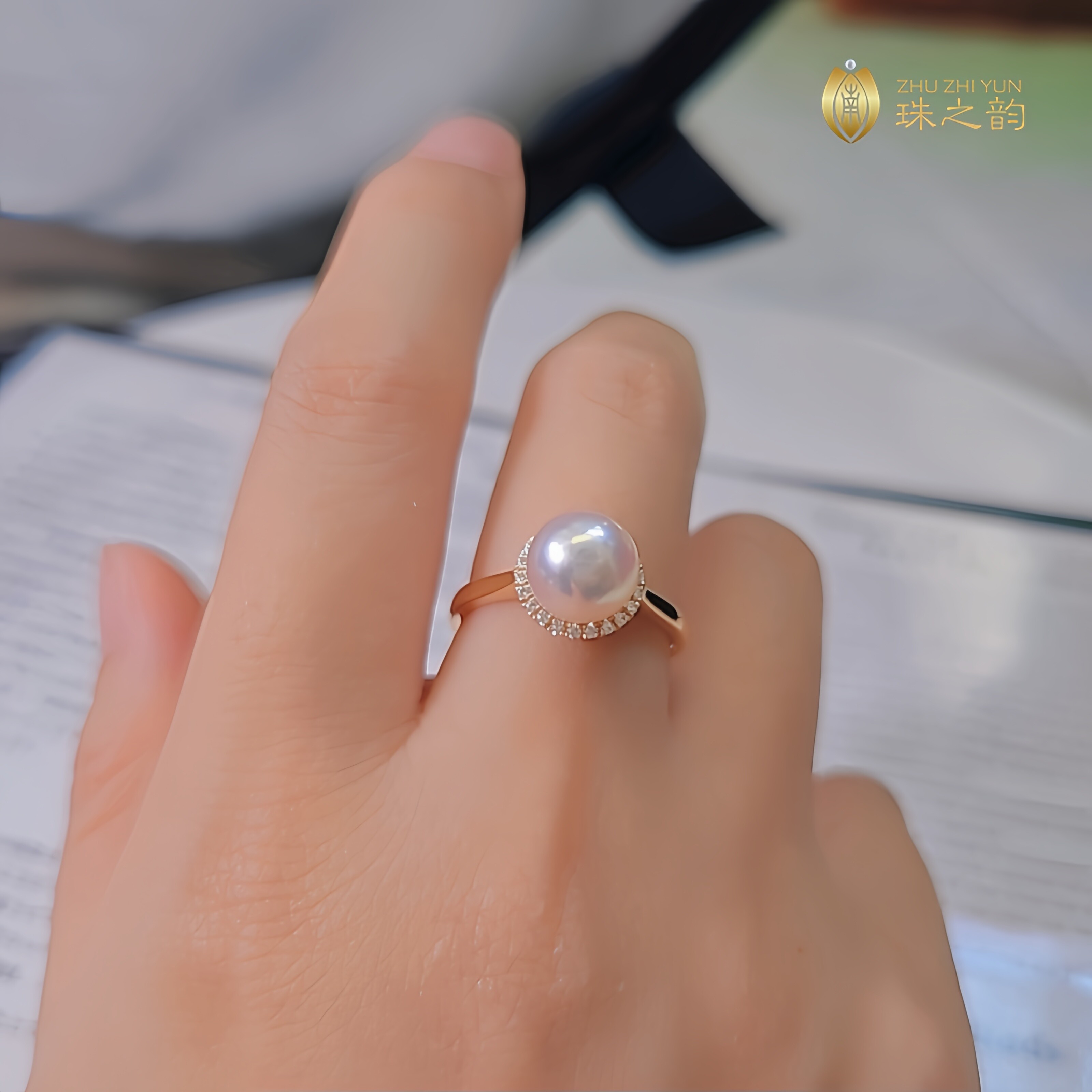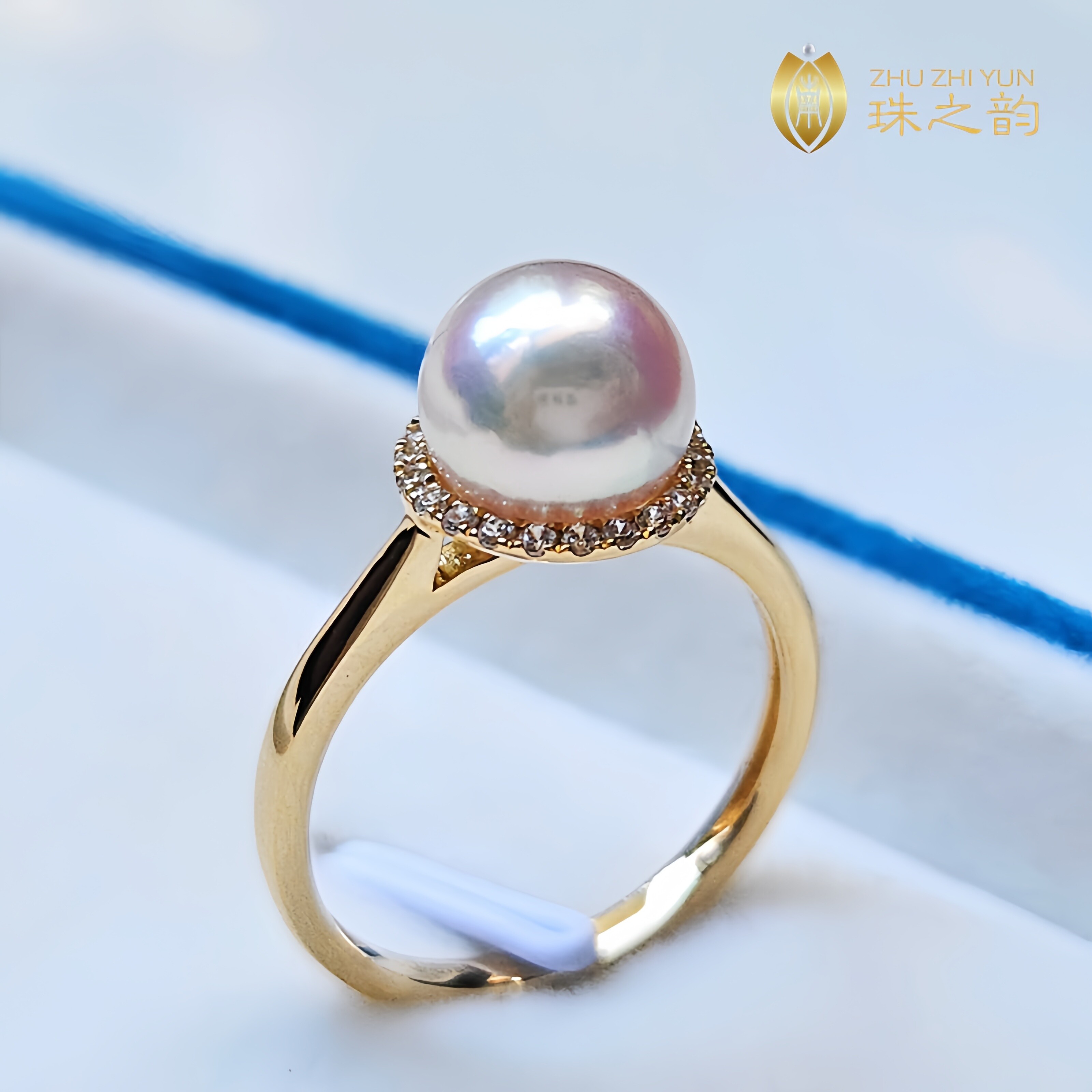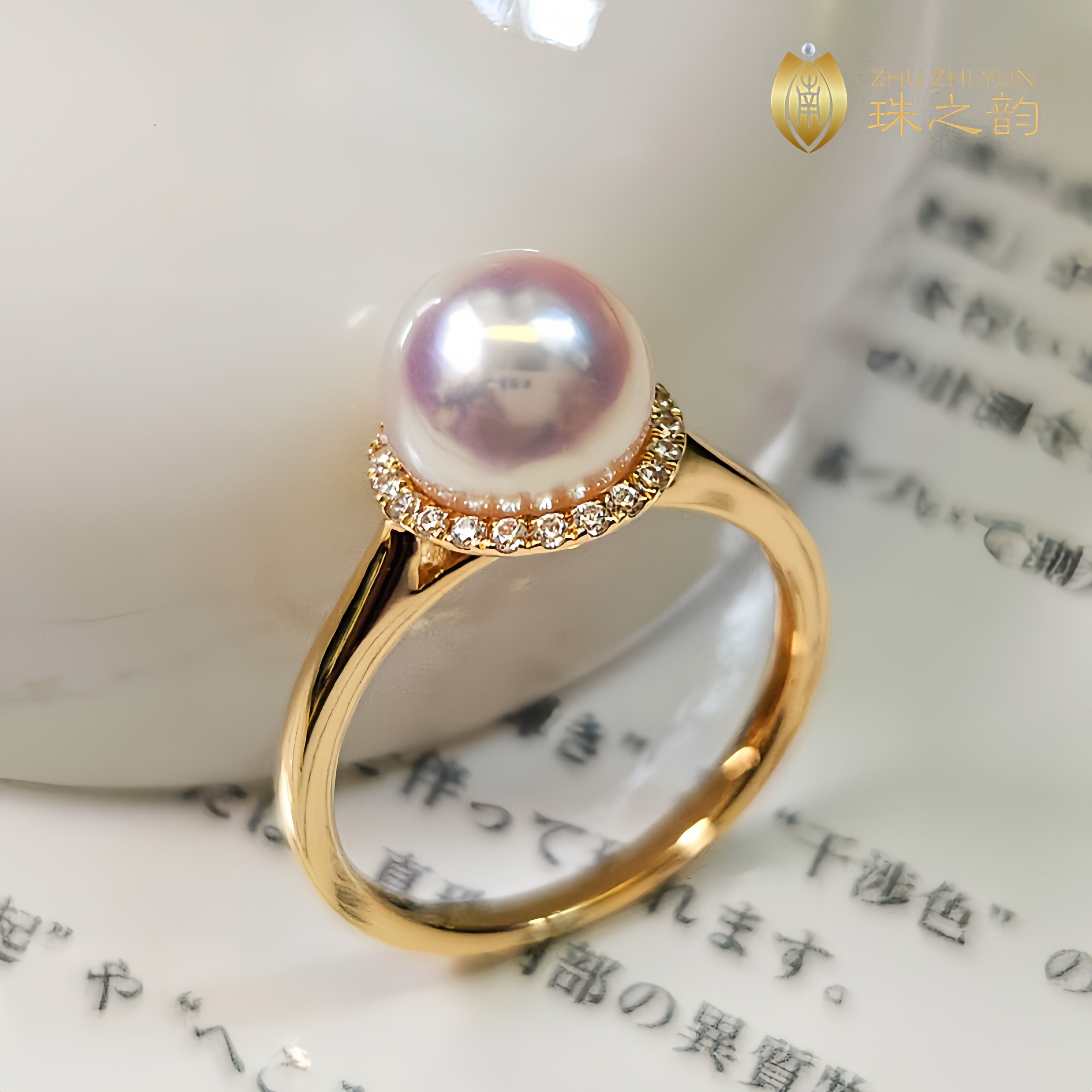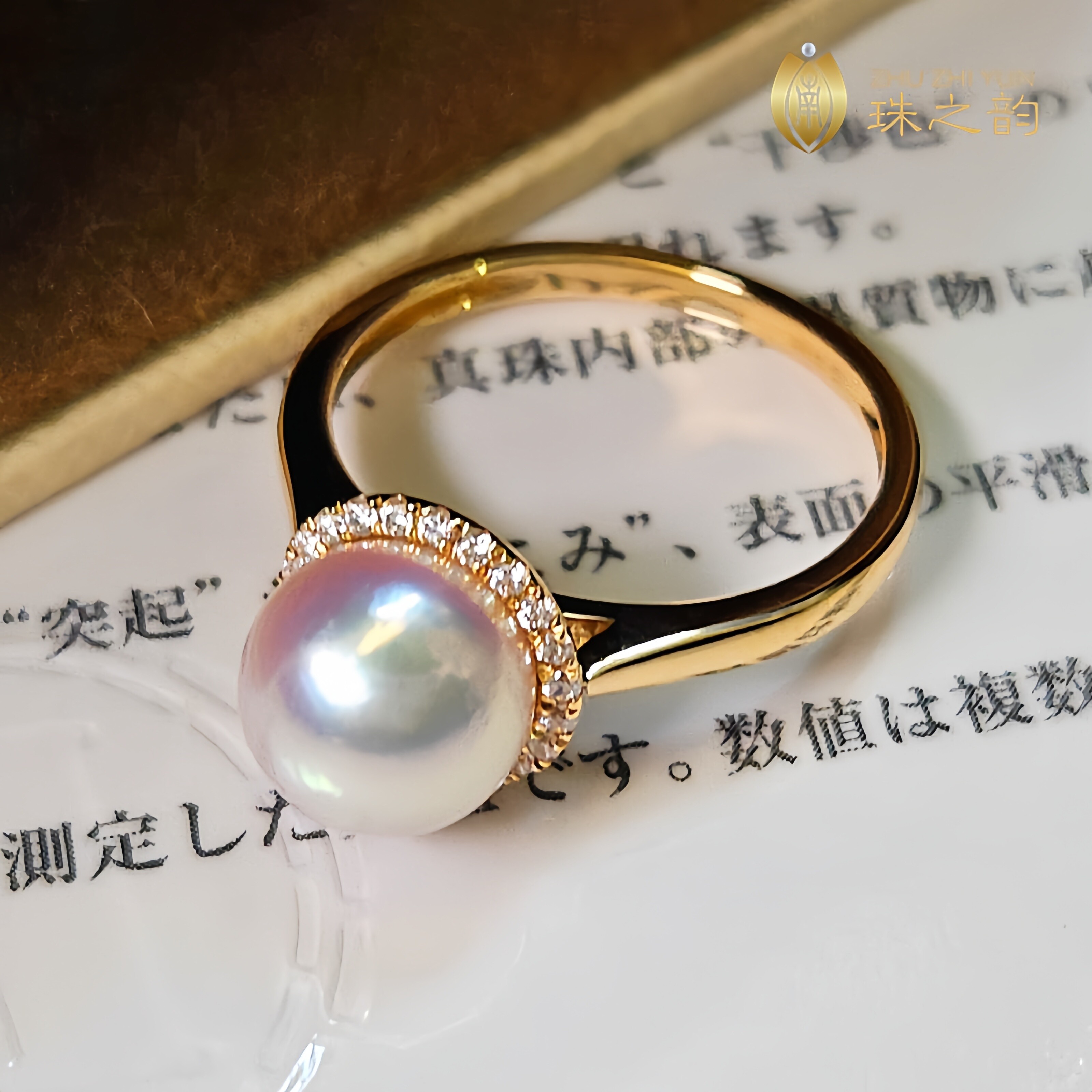 📚 极光天女日本akoya天然海水珍珠戒指18k金钻石超厚实款正圆小灯泡