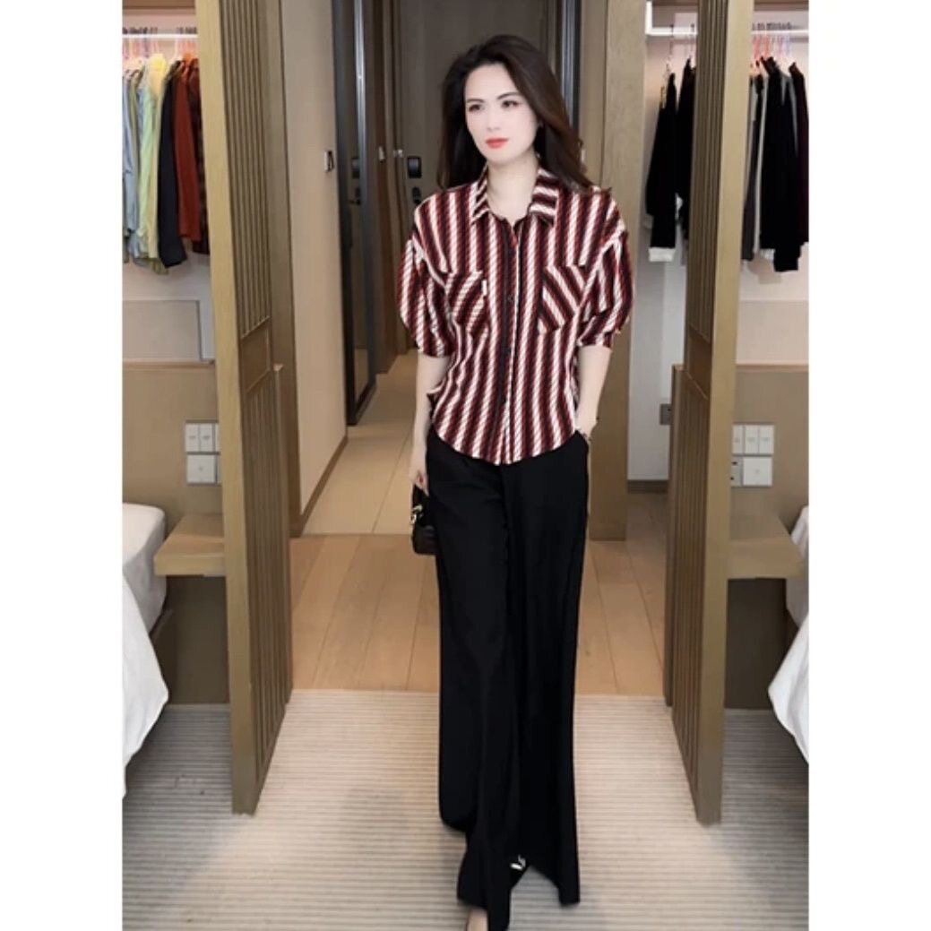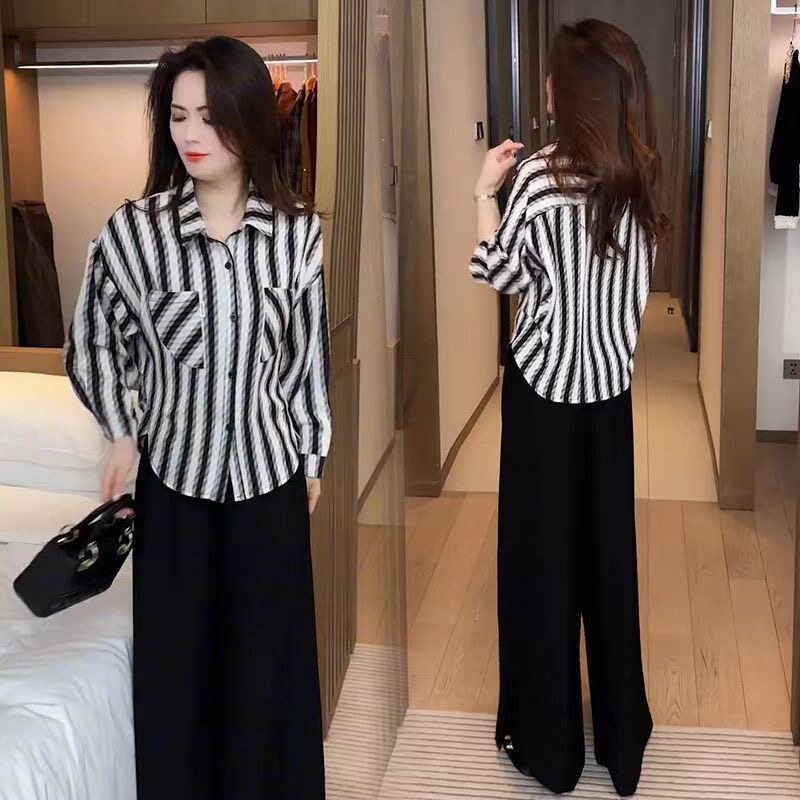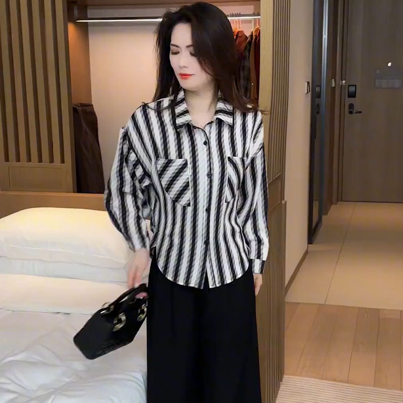 📚 新款polo领宽松洋气衬衫外套春夏长袖慵懒风条纹休闲女款开衫上衣