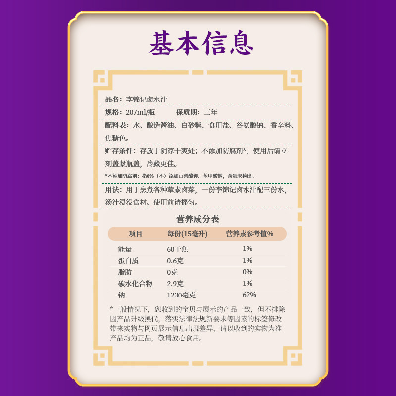 📚 李锦记零添加防腐剂卤水汁207ml*3瓶秘制卤料调料卤荤菜