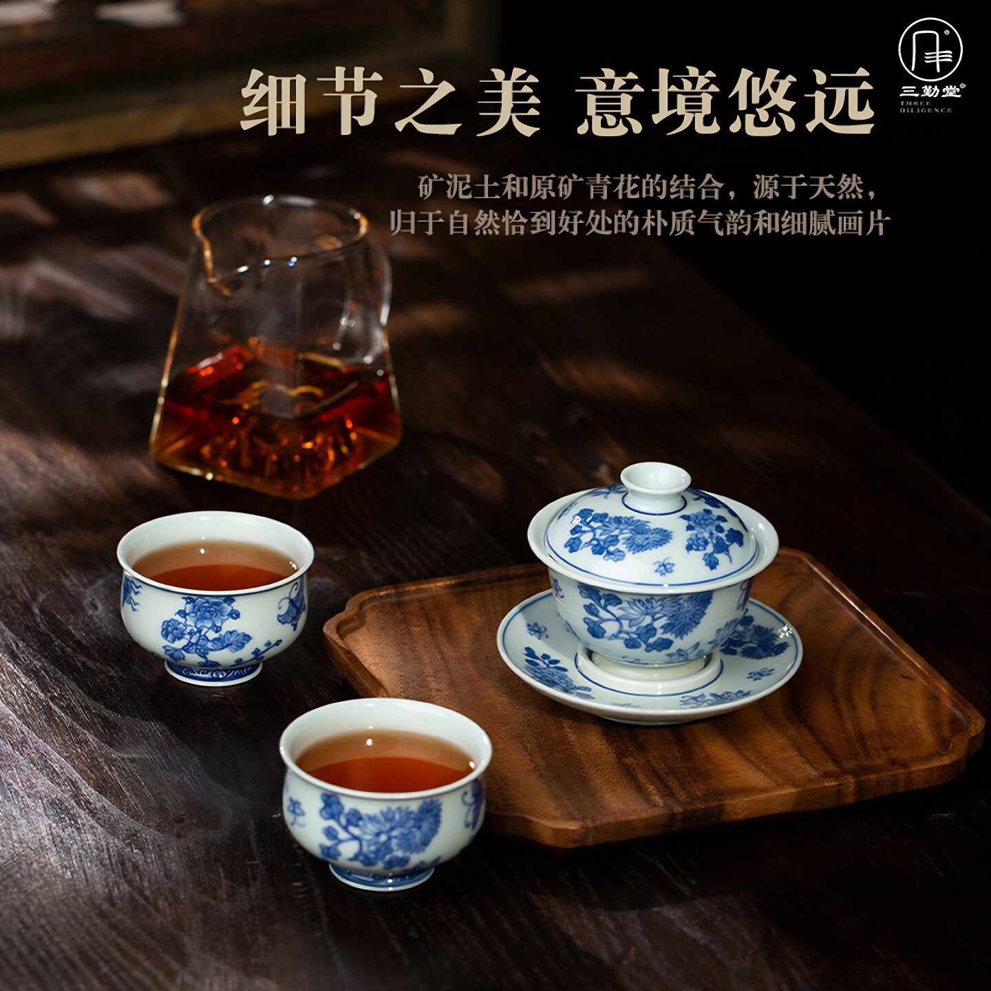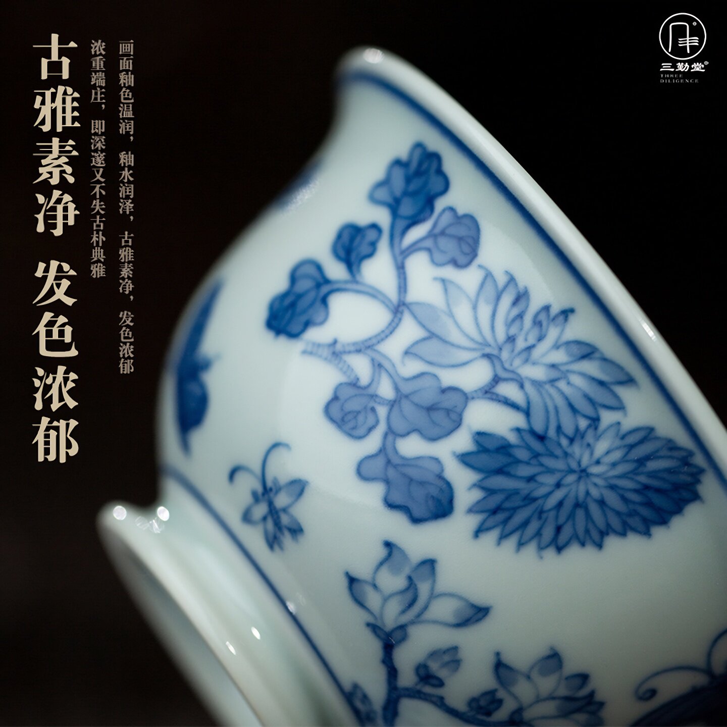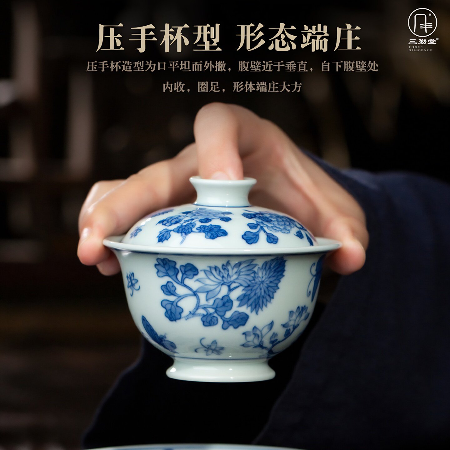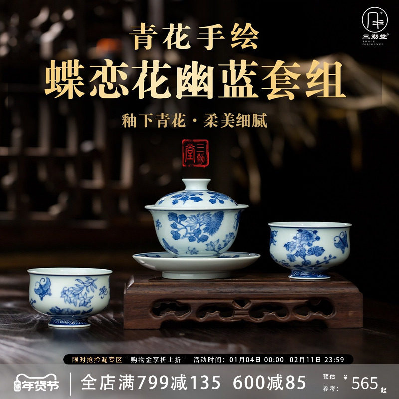 📚 三勤堂手绘青花蝶恋花马蹄套组景德镇陶瓷功夫高档家用主人杯盖碗