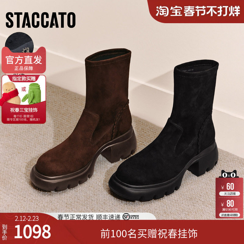 📚 思加图冬季通勤弹力靴瘦瘦靴中靴厚底增高女靴子Y2563DZ5