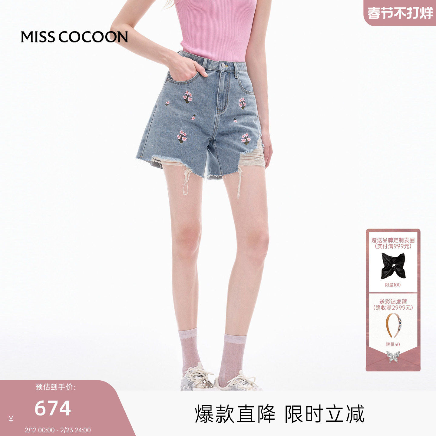 📚 MISSCOCOON可可尼刺绣牛仔短裤女2025秋季新款破洞休闲薄款热裤