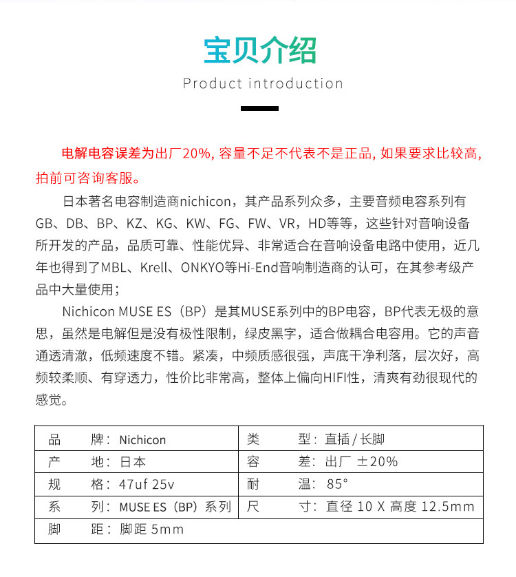 📚 47UF 25V Nichicon 尼吉康MUSE BP无极音频电容 日本进口耦合电容
