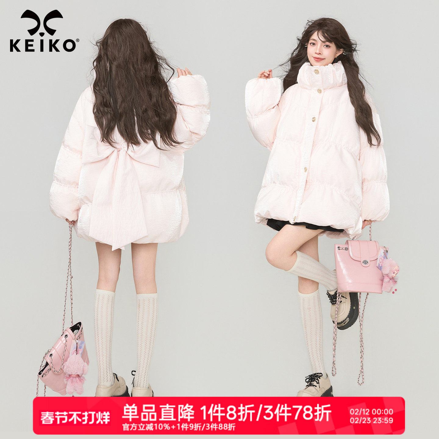 📚 KEIKO 虹彩光泽缎面粉色泡芙棉服2025冬季流光少女蝴蝶结外套棉袄