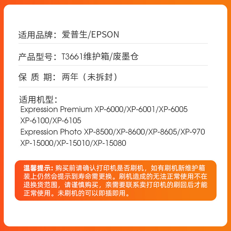 47¥ HU006 LxMOUjVnLrk¥ https://m.tb.cn/h.7HOPswO NBN适用爱普生T3661维护箱 EPSON XP-8500 XP-8600废墨仓 XP-15000 XP-15080打印机维护箱 废墨仓 废墨收集器 --------------------- 【原售价】19.8元 【现售价】21元。