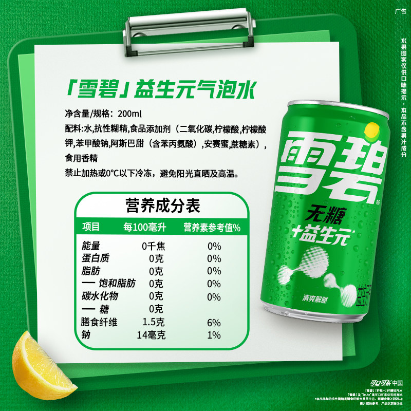 📚 [黄子弘凡代言]雪碧益生元气泡水无糖汽水mini200ml*12罐整箱饮料
