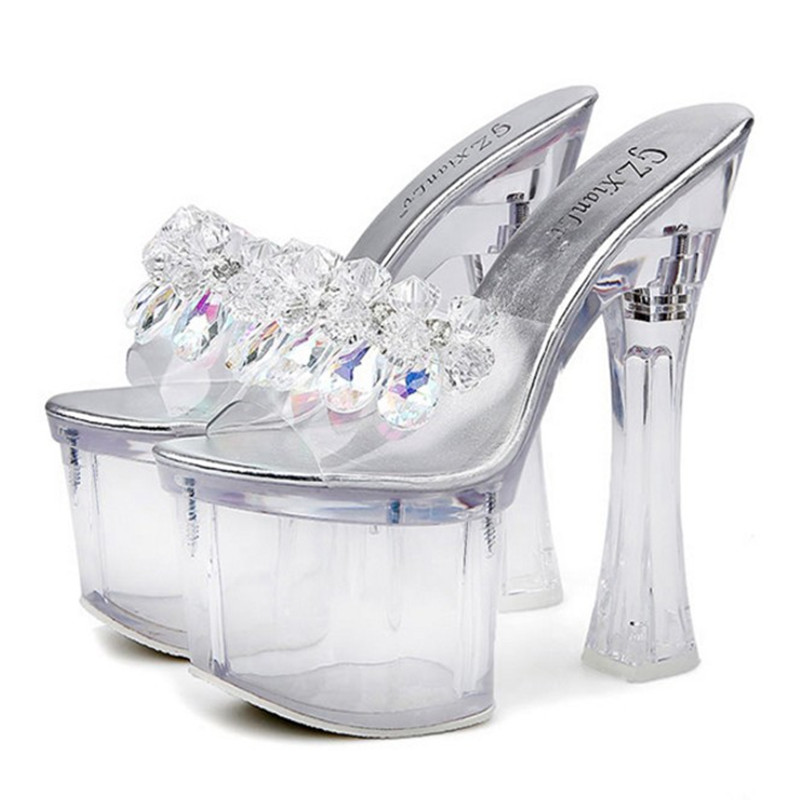 📚 18CM超高跟鞋粗跟凉鞋防水台厚底透明水晶鱼嘴拖鞋恨天高夜店女鞋