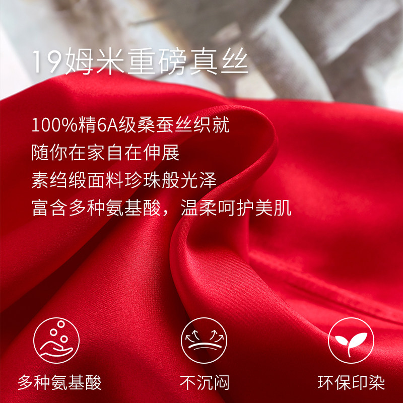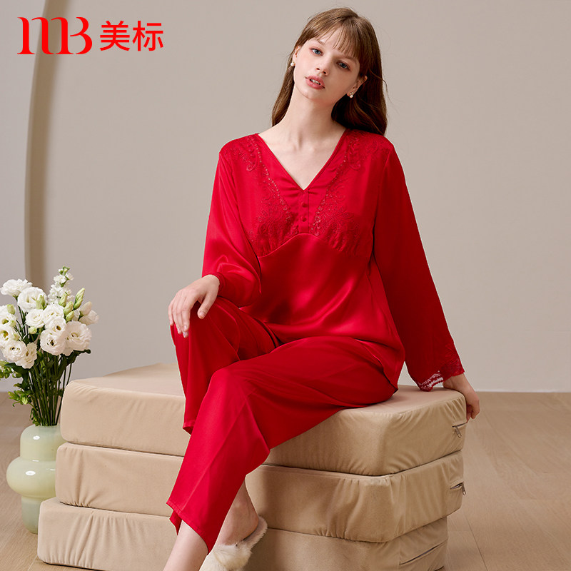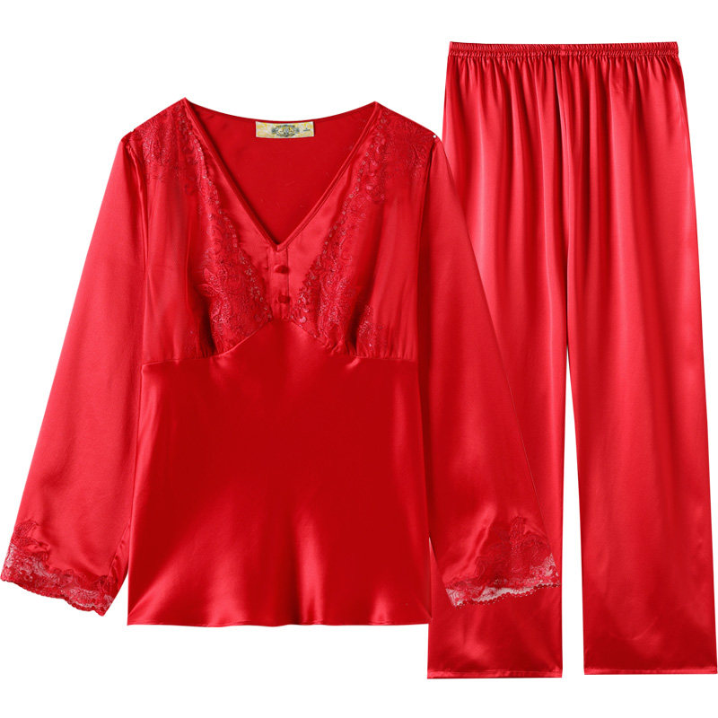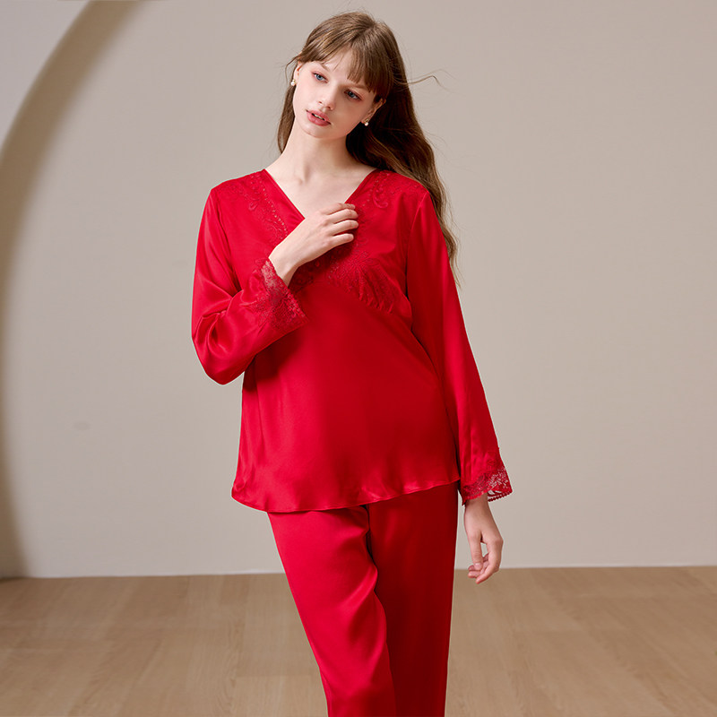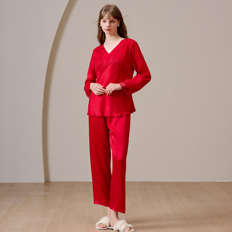 📚 美标真丝睡衣套装女春秋本命红色婚庆100%桑蚕丝蕾丝九分袖家居服