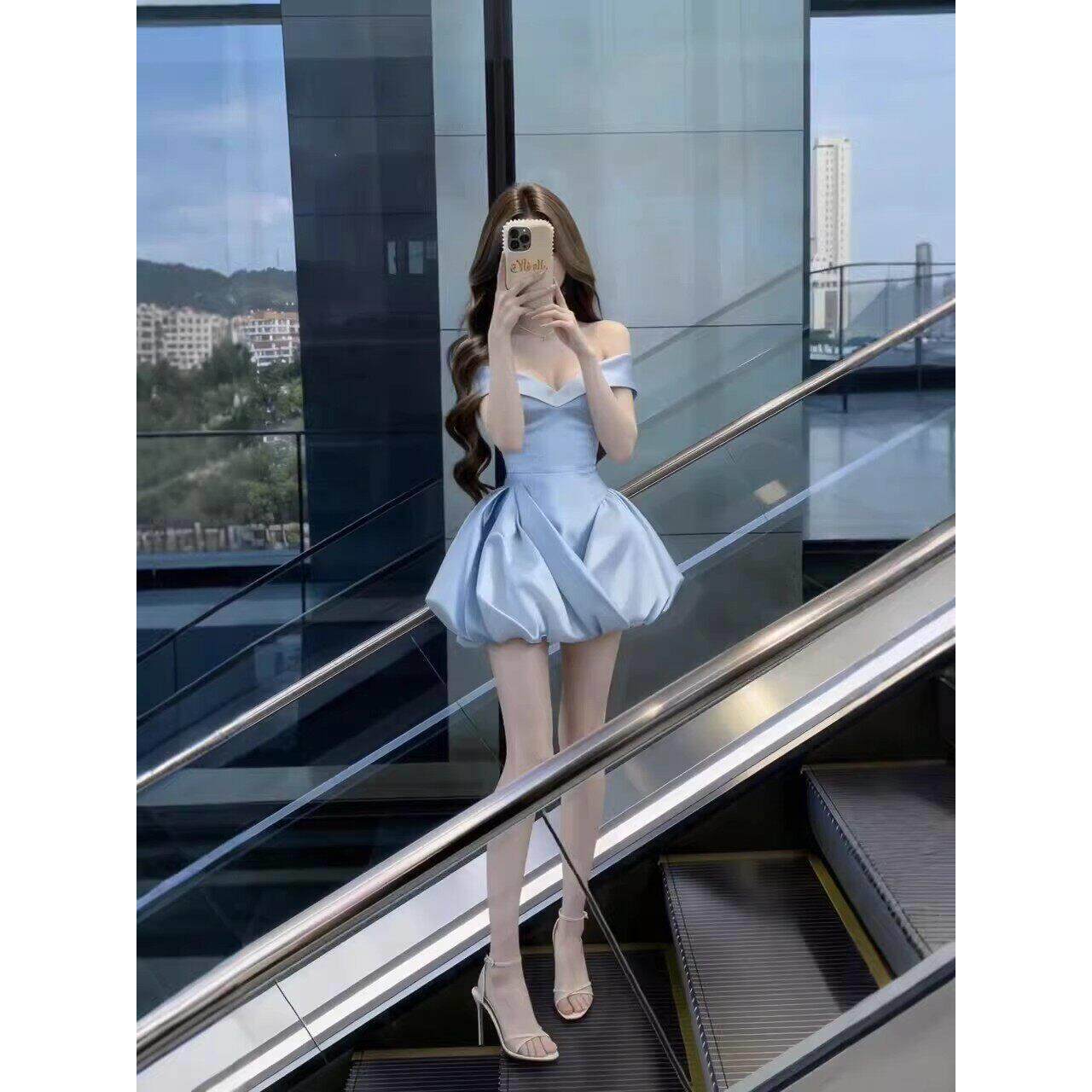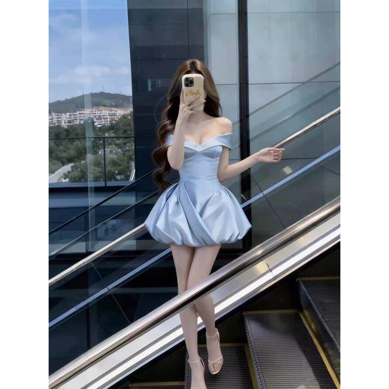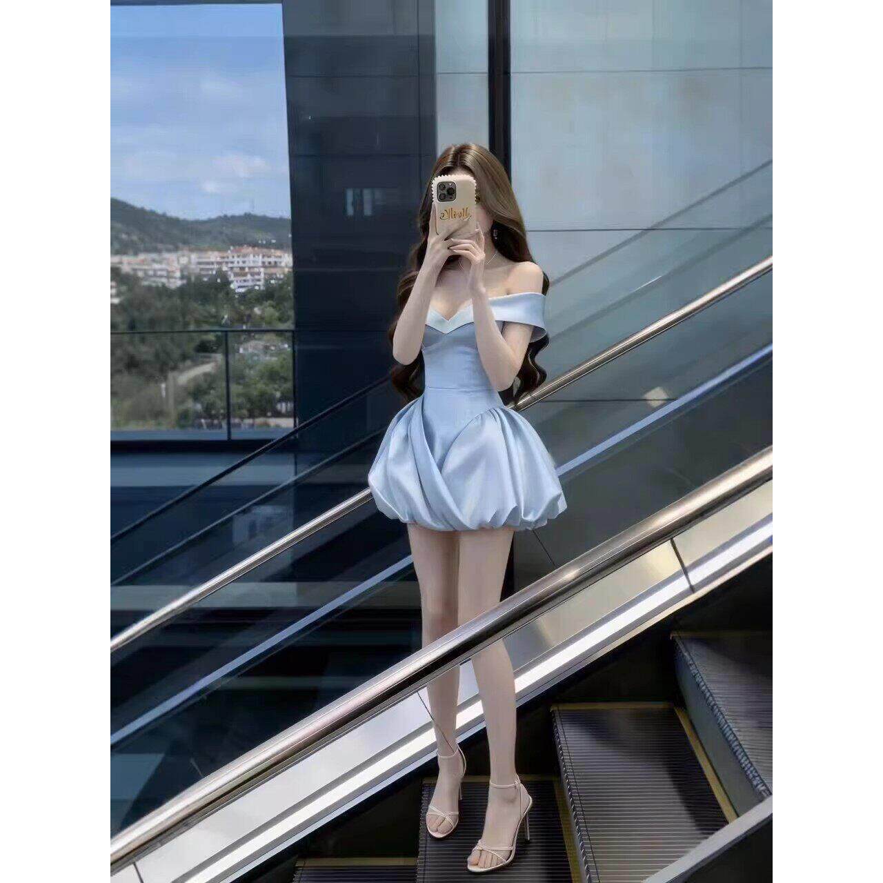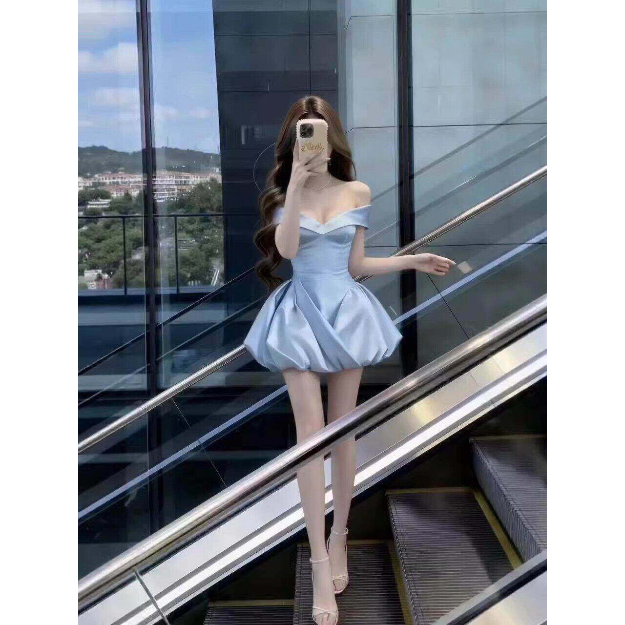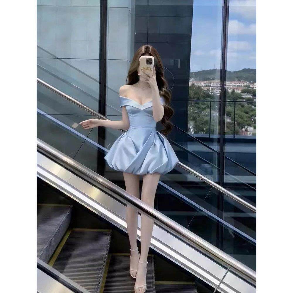 📚 蓝色连衣裙女高级感重工法式party轻礼裙收腰一字肩公主生日裙子
