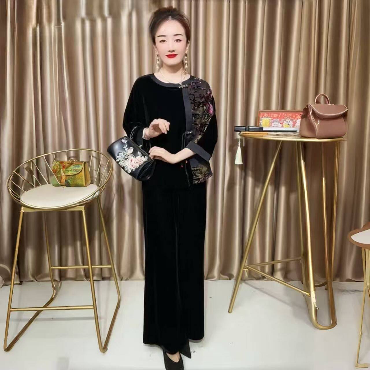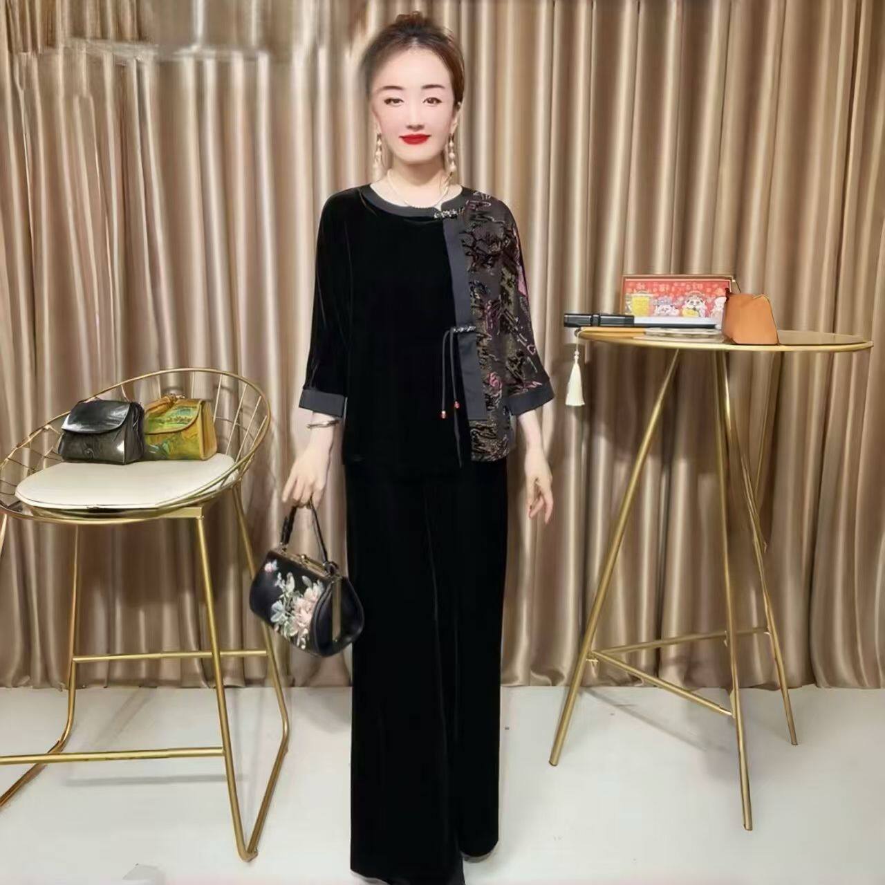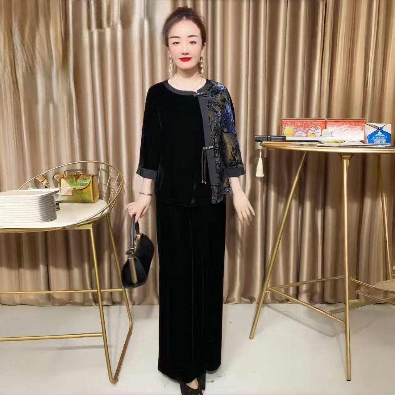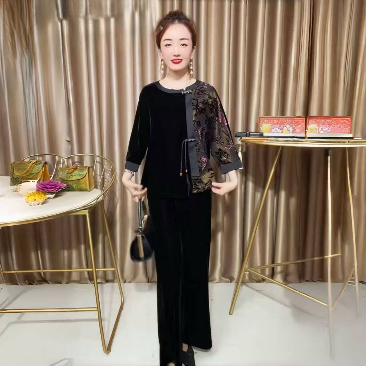 📚 阔太太国风新款提花撞色中老年妈妈上衣秋季新款丝绒洋气大码显瘦