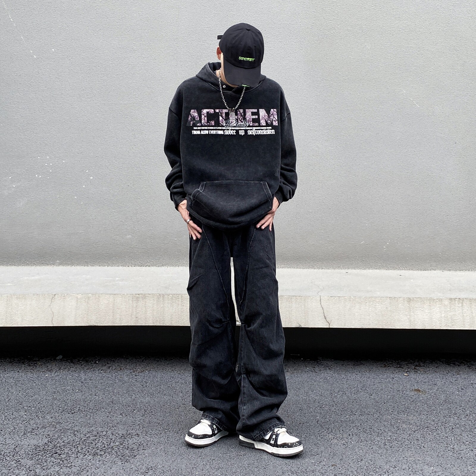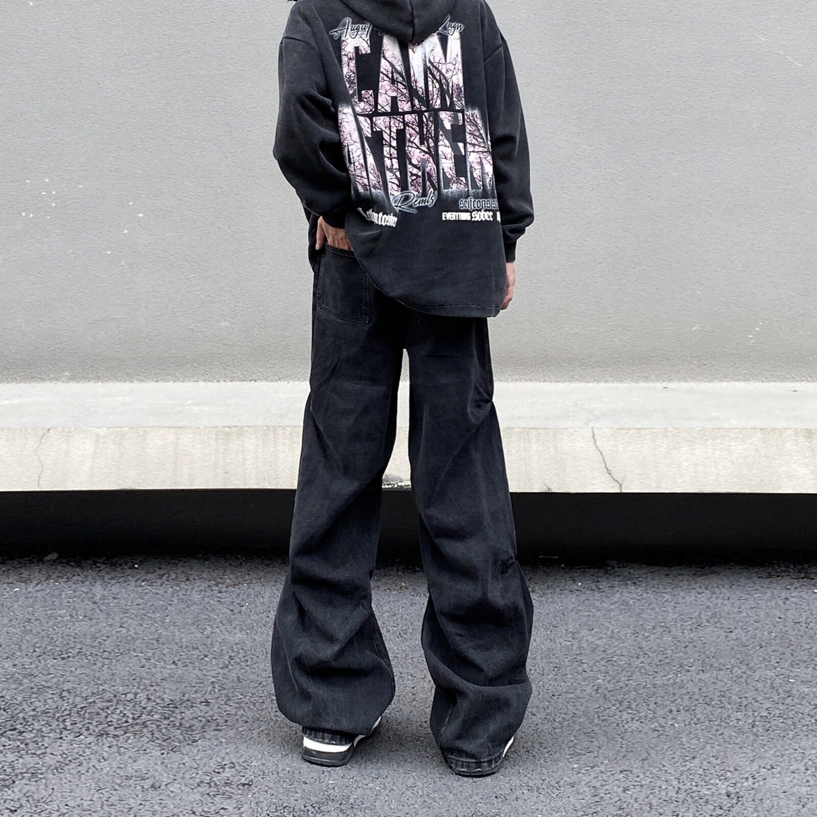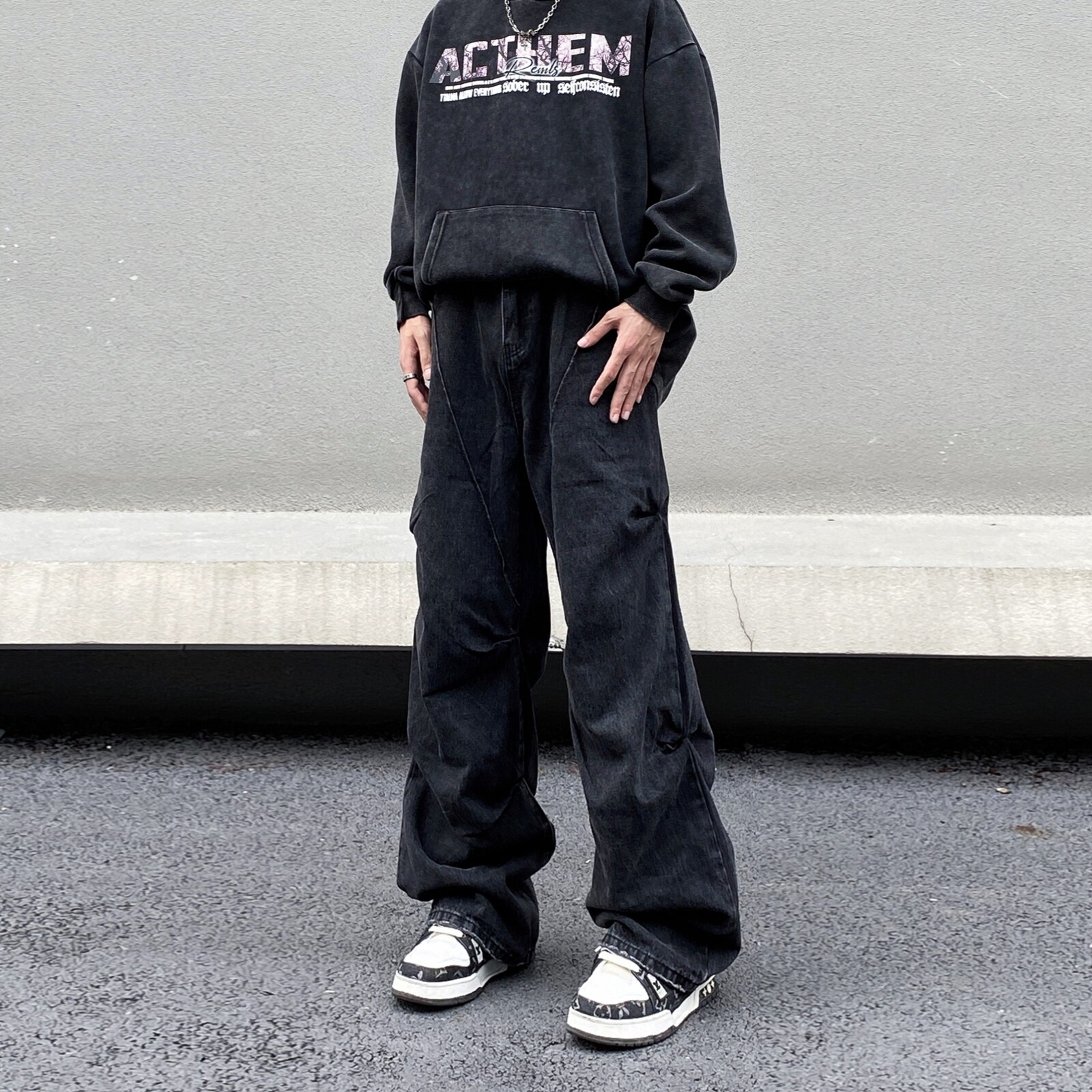 📚 美式高街复古水洗做旧bootcut褶皱牛仔裤男痞帅宽松微喇vibe裤子