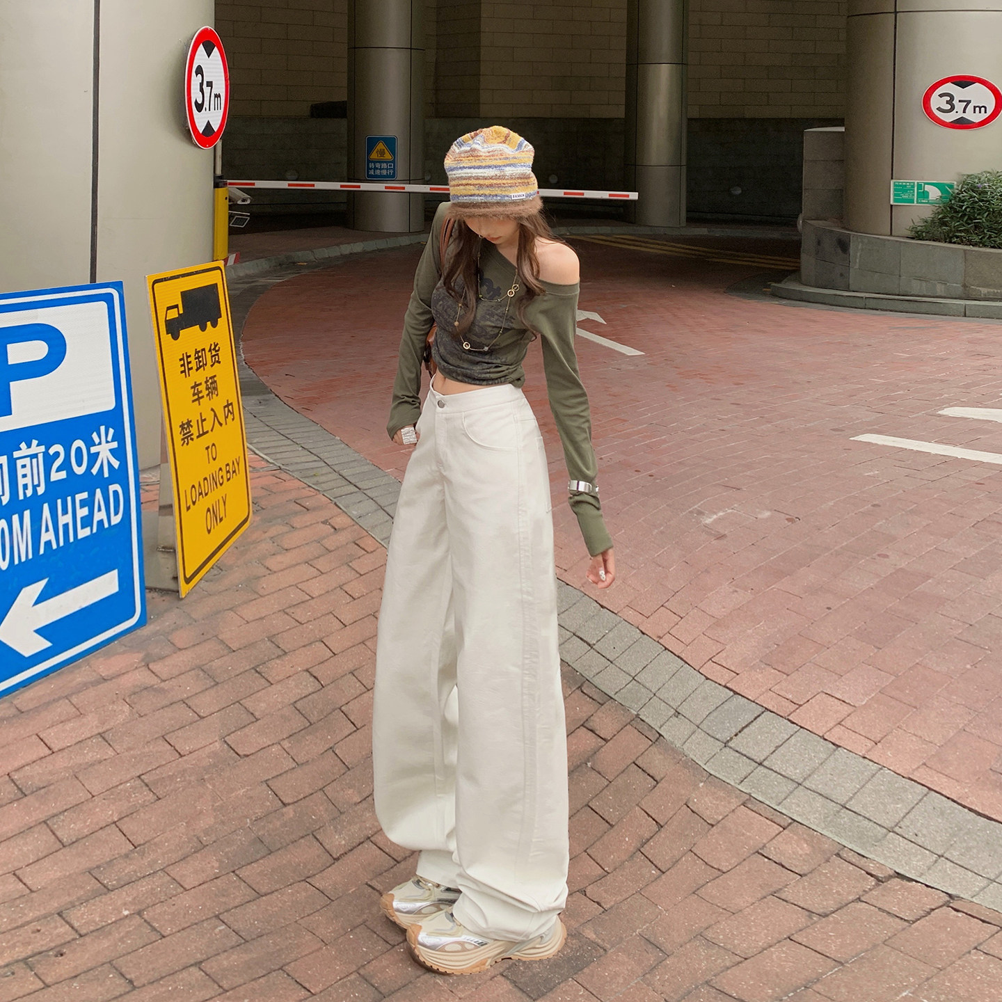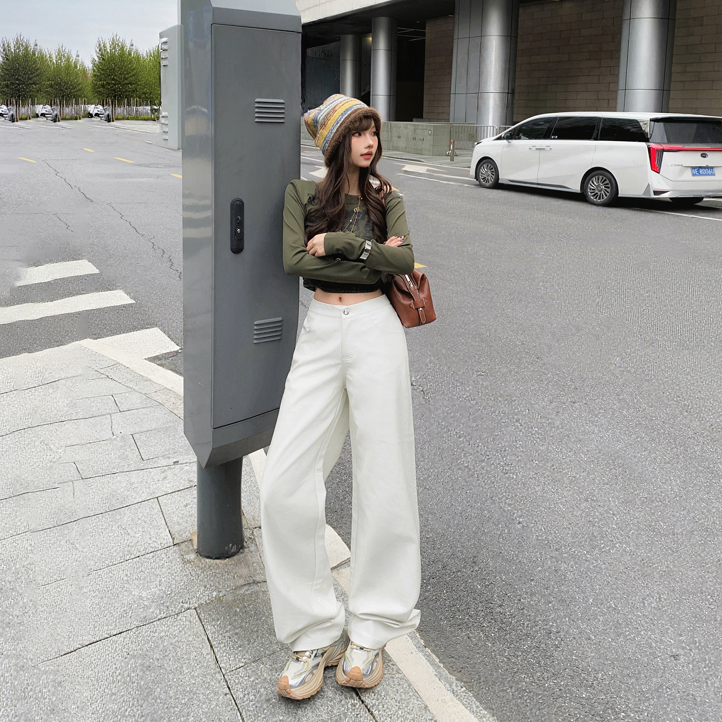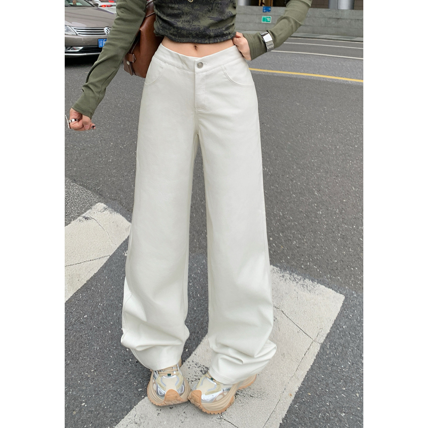 📚 YC&美式复古低腰辣妹宽松直筒裤白色皮裤百搭显瘦休闲裤女