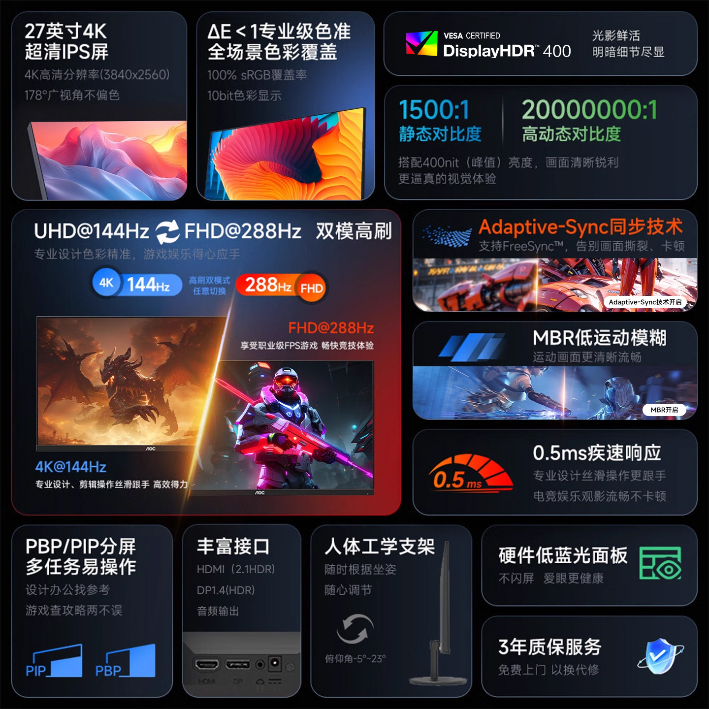 📚 AOC显示器27英寸4K设计144Hz双模IPS游戏娱乐电脑外接屏幕U27E11X