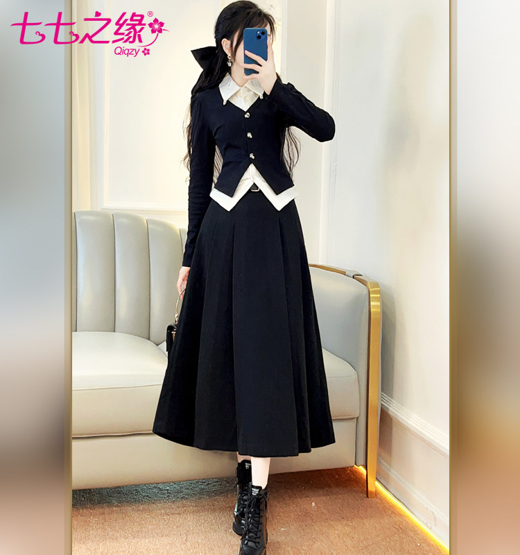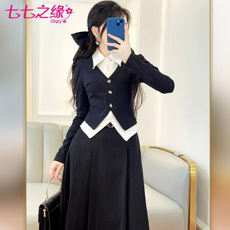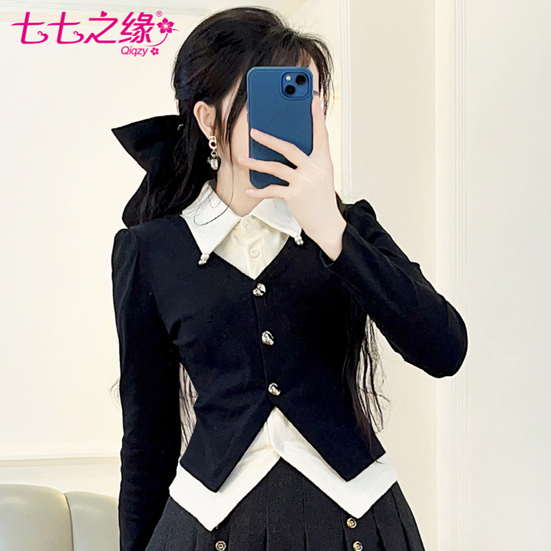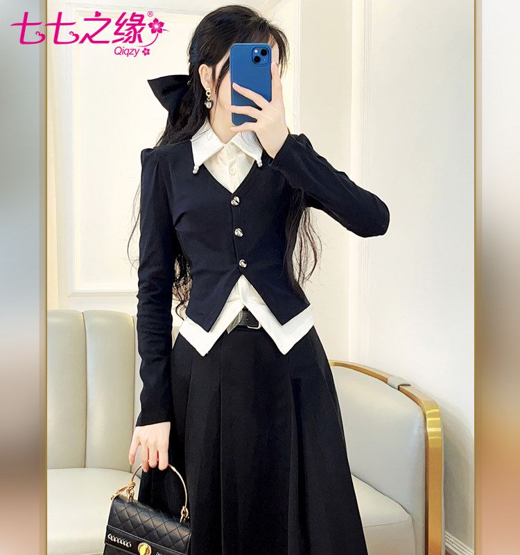 📚 七七之缘春秋新款女装 假两件polo领衬衫不规则设计感上衣半裙