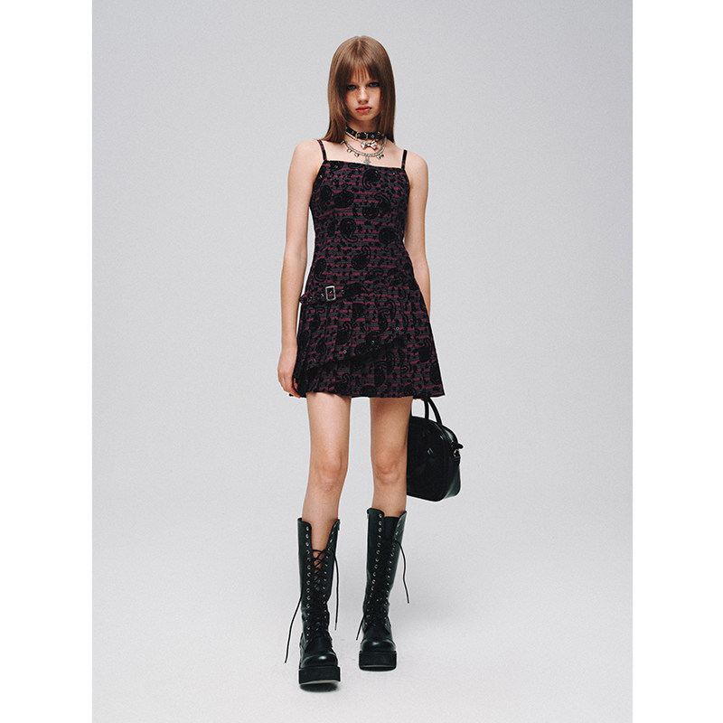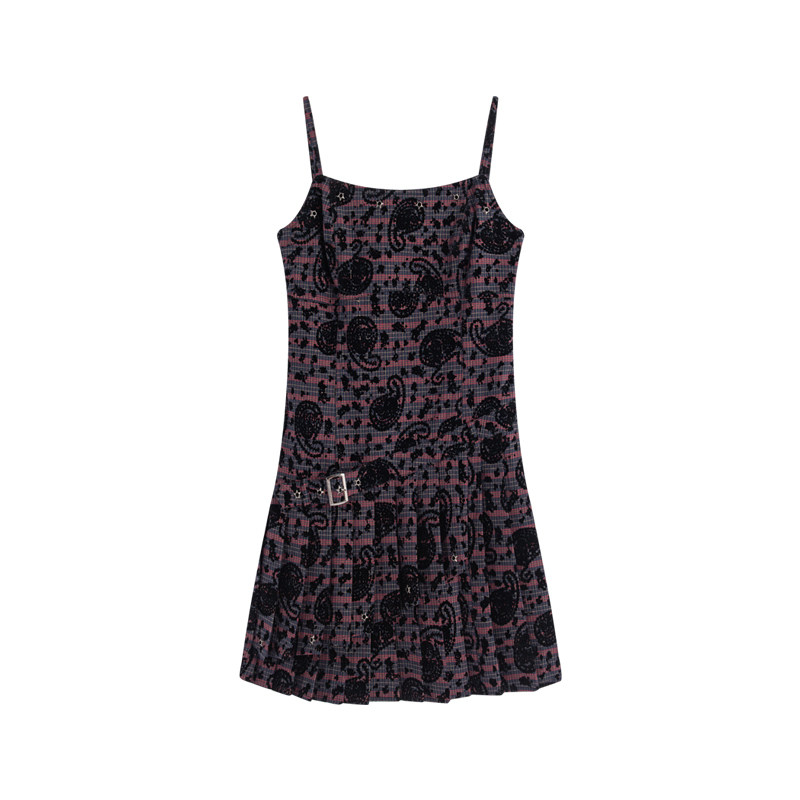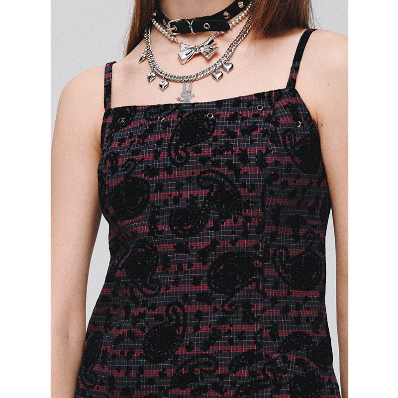 📚 Lapaki Paka 经典腰果花植绒纹样 美式复古收腰格纹吊带连衣裙