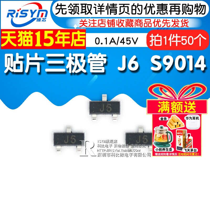 📚 Risym 贴片三极管J6 S9014贴片 印字J6 0.1A/45V SOT23 NPN 50只