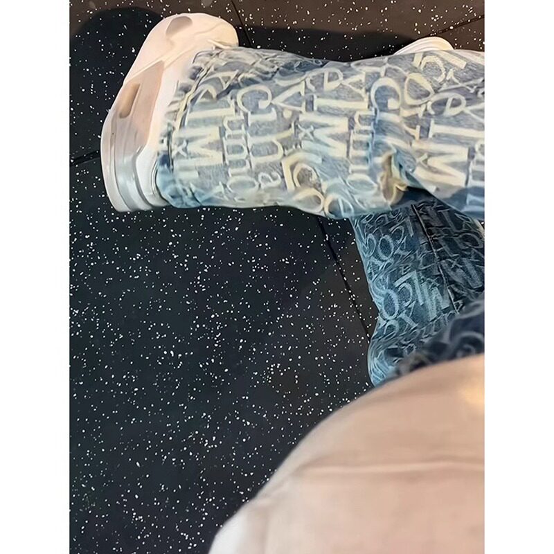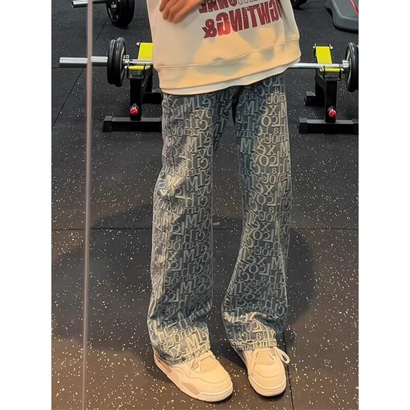 📚 浅蓝色字母提花满印牛仔裤男款夏季美式潮牌vibe修身弯刀微喇裤子