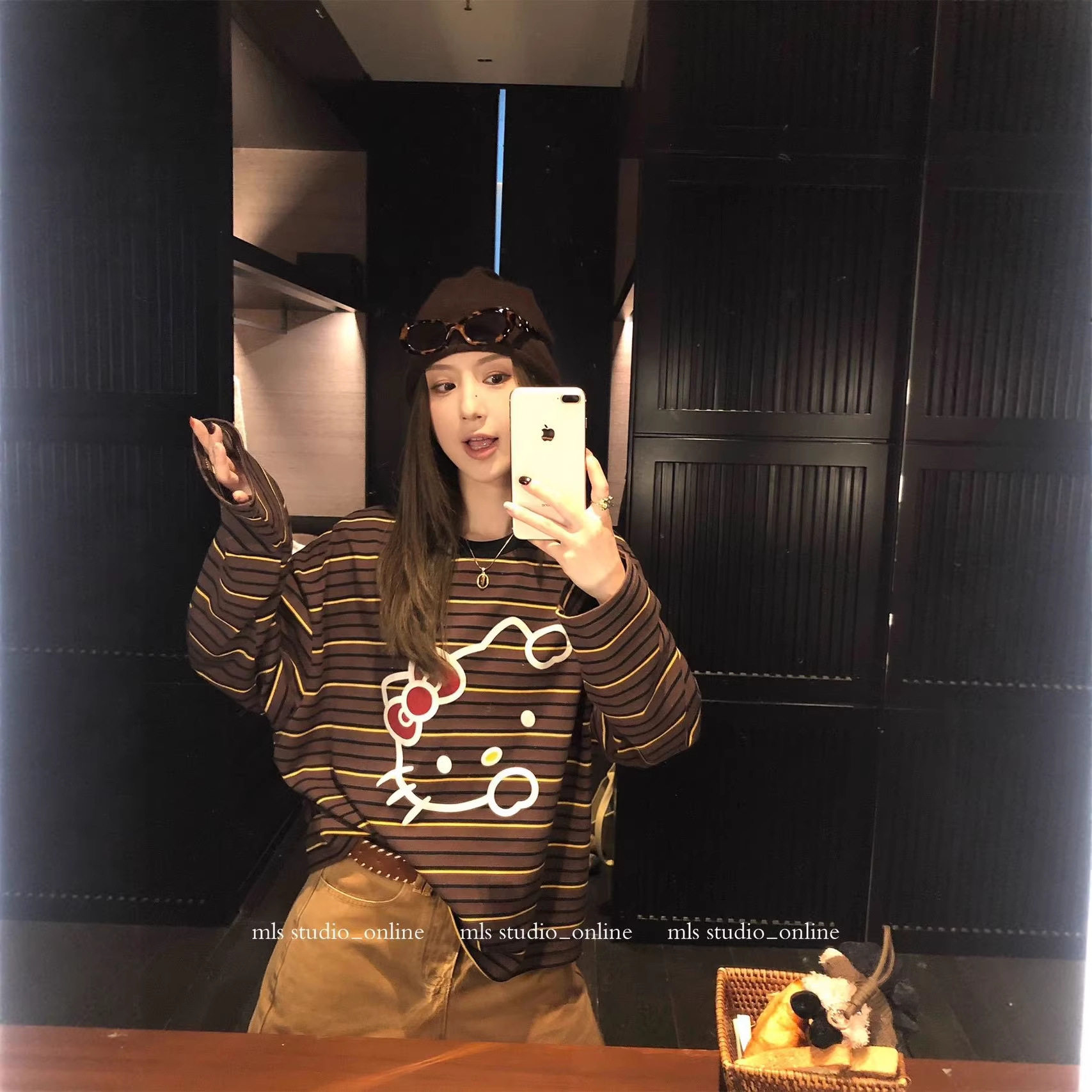 📚 东大门Kitty印花撞色条纹宽松长袖T恤女ins 2026韩系早春圆领上衣