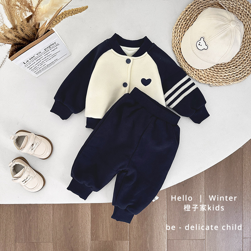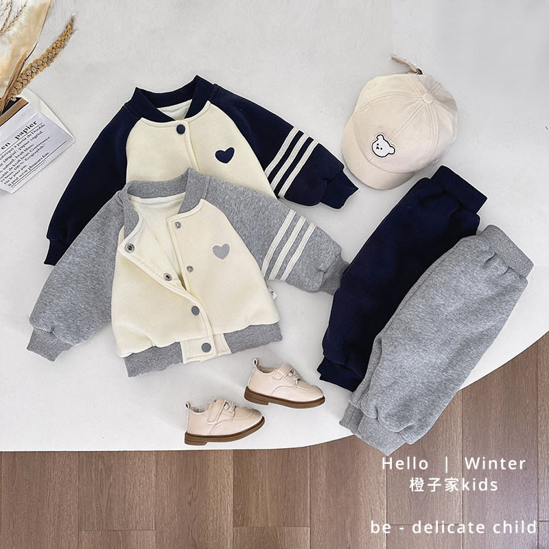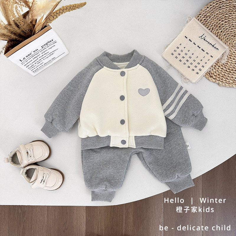 📚 男宝宝冬季套装女童加绒爱心棒球服两件套婴幼儿保暖裤子运动衣服
